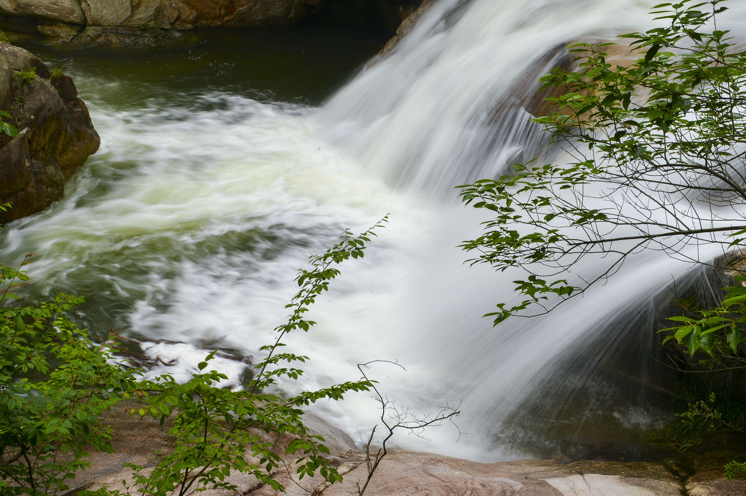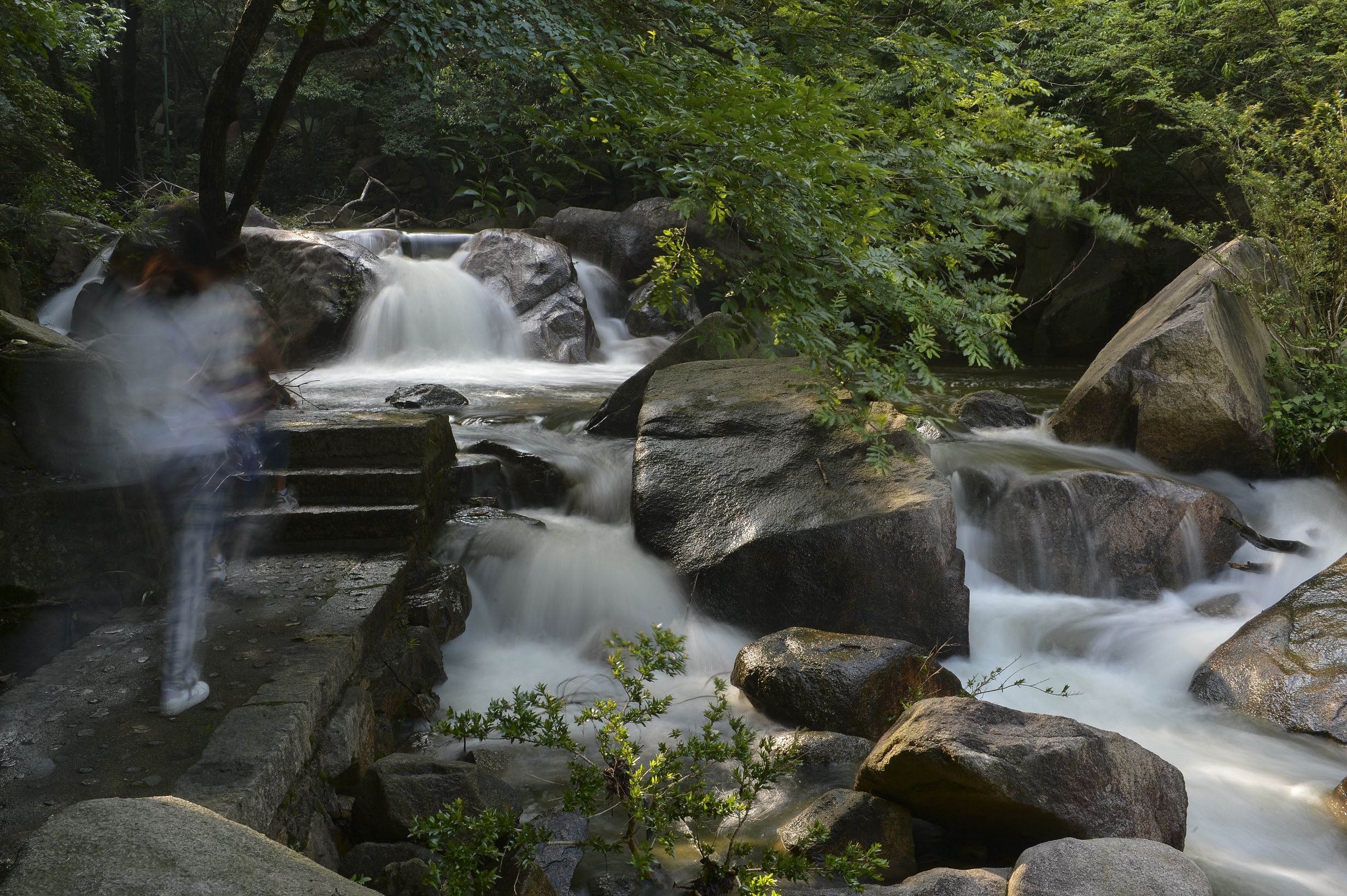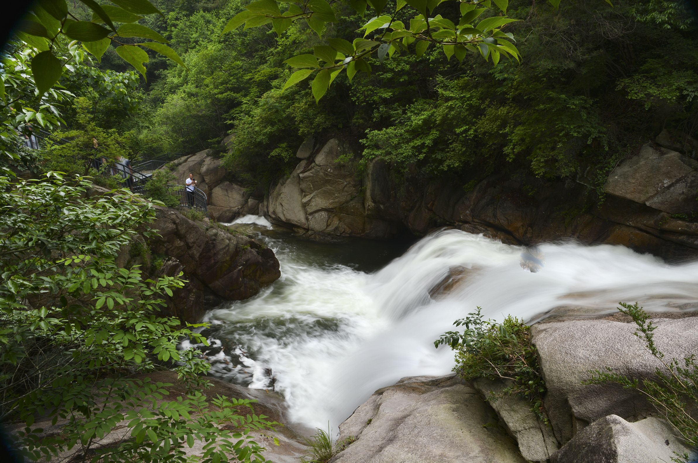 ??被雨水浸潤的巖石泛著幽光,溪水漫過石面,激起層層銀白浪花。遠處瀑布如白練懸空,轟鳴著墜入深潭,騰起蒙蒙水霧,帶來絲絲清涼。