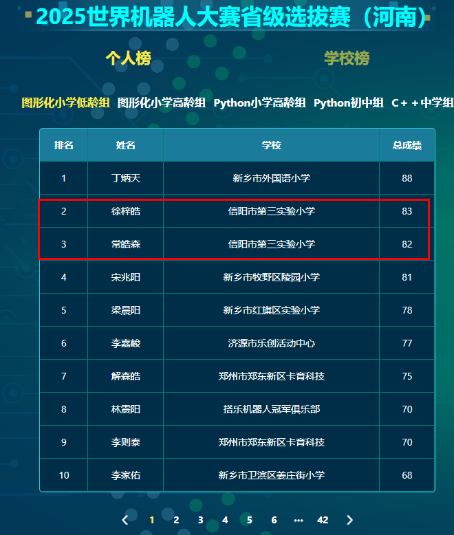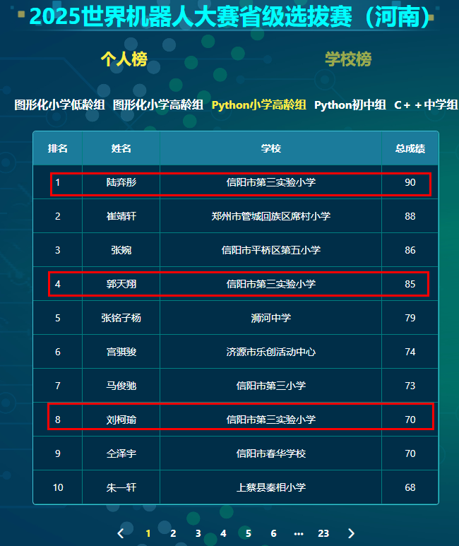 喜報[慶祝][慶祝]祝賀信陽市第三實驗小學樂碼編程社團學員陸弈彤、徐梓皓、常皓森、郭天翔、劉柯瑜、胡樂天、李思佑等7名同學在教育部白名單賽事—《WRC 2025世界機器人大賽河南省賽》中,全部斬獲省賽一等獎,晉級全國錦標賽。其中陸弈彤榮獲python小學高齡組全省冠軍,徐梓皓、常皓森分別榮獲圖形化小學低齡組全省亞軍和季軍!郭天翔、劉柯瑜等多名同學進入全省前10名[慶祝][慶祝][慶祝]