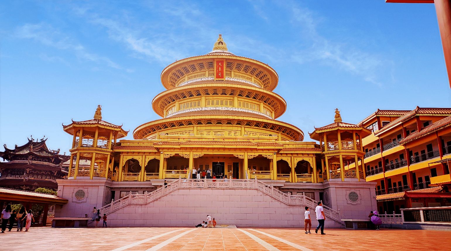 惠安科山公園的“小天壇”——大乘閣,太驚艷啦!三重檐的金色圓形大殿,仿若北京天壇祈年殿的“孿生姐妹”,在藍天映襯下,鎏金外觀熠熠生輝,精致的斗拱、雕花,盡顯閩南建筑工藝之美。踏上漢白玉石階走近,殿宇恢弘大氣,檐角飛翹似要乘風。周圍紅墻建筑環繞,更襯得它華貴莊嚴。來這兒,既能感受古建筑的獨特韻味,還能拍美美的照片,很值得一逛~