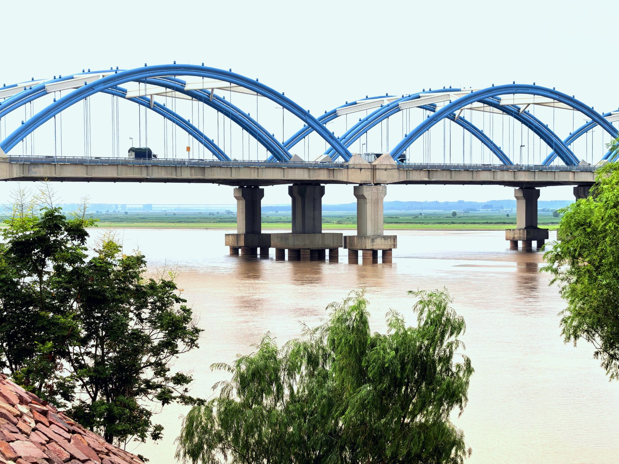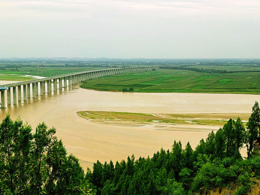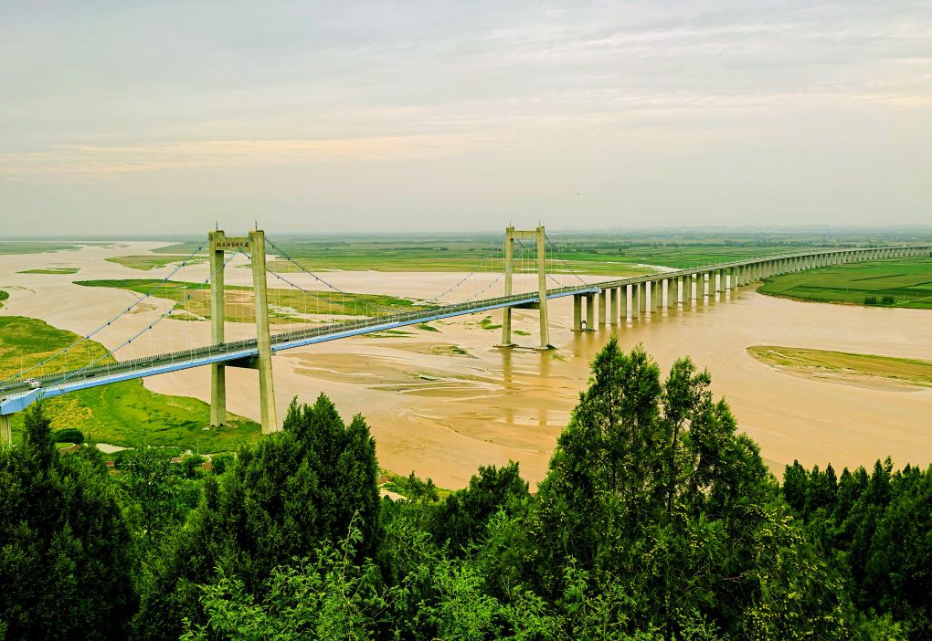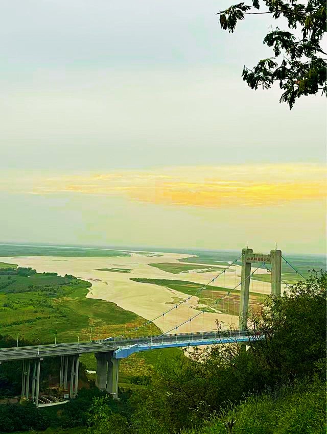 黃河如帶,大橋似虹,橫跨其上。兩岸綠野展鋪,生機盎然,與黃河水相映,盡顯山河壯闊與歲月悠然。