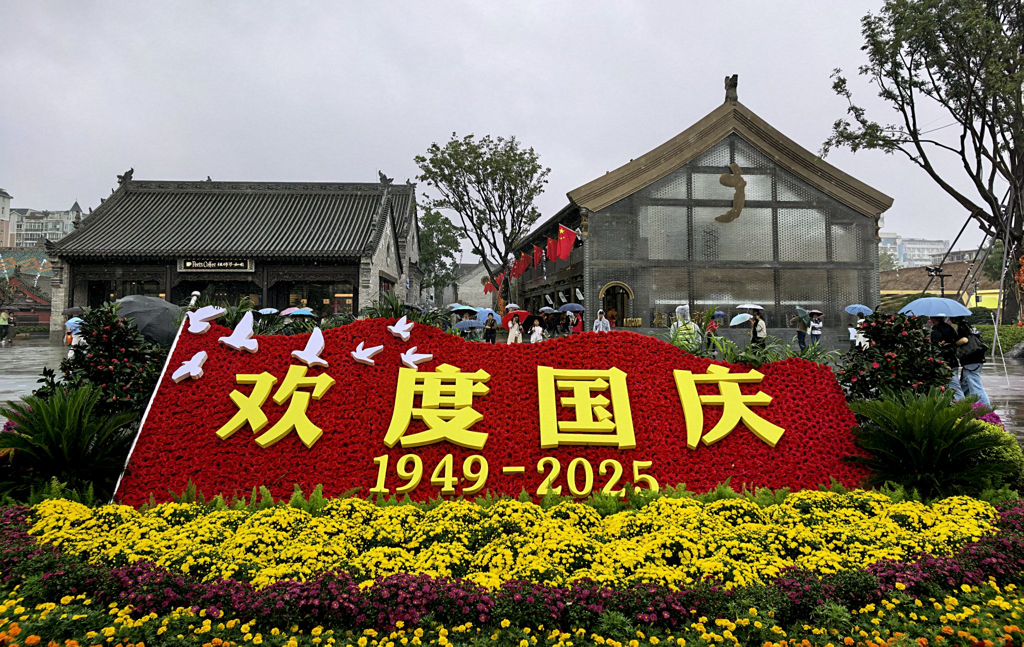 喜雨沾襟, 長街處、 花團錦簇。 抬望眼、 丹朱盈目, 大字凝馥。 七十余載風雨路, 萬千家國情深處。 正此時、 鴿哨掠長空, 歌如縷。