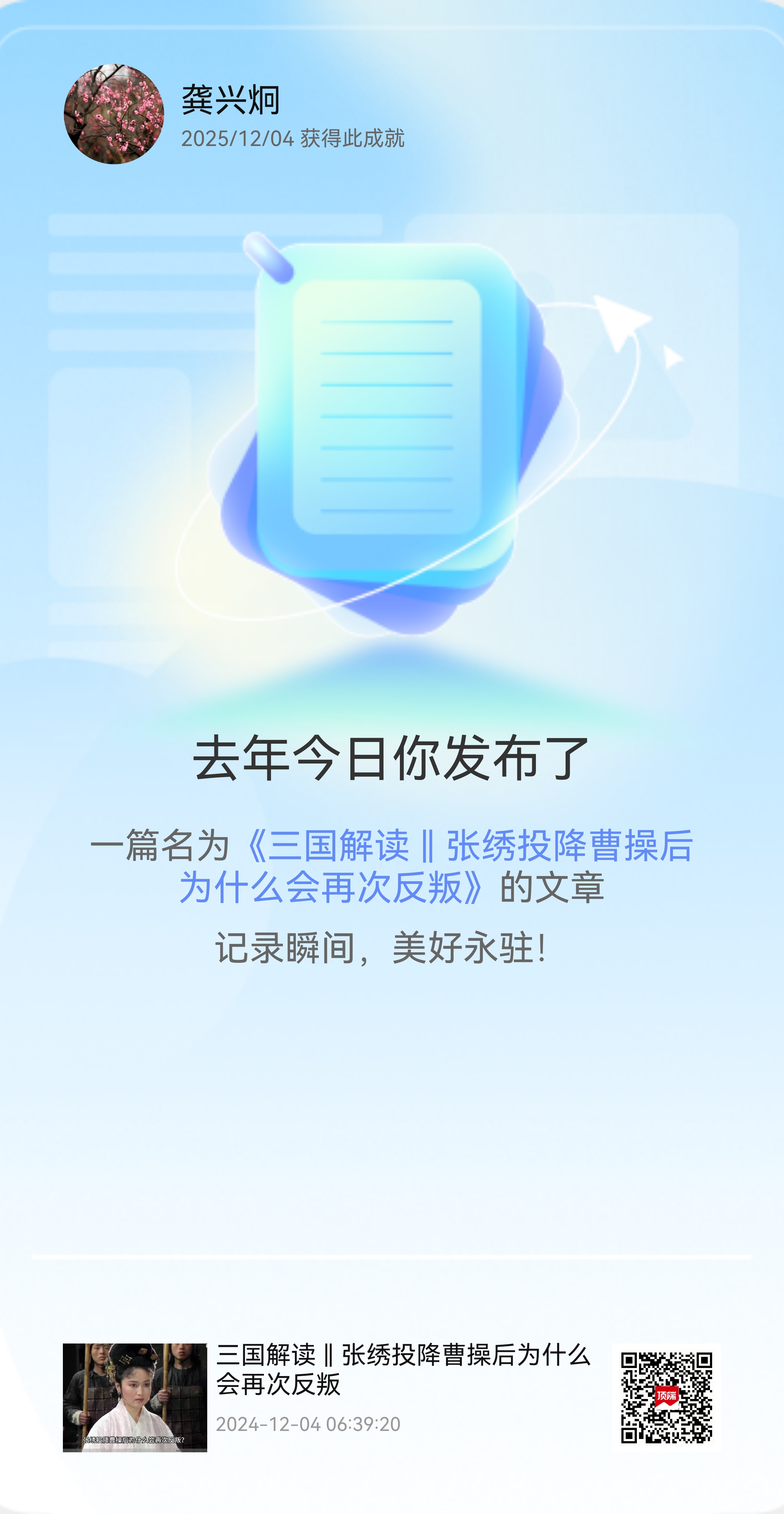 去年今日我在頂端發布了《三國解讀‖張繡投降曹操后為什么會再次反叛》!
