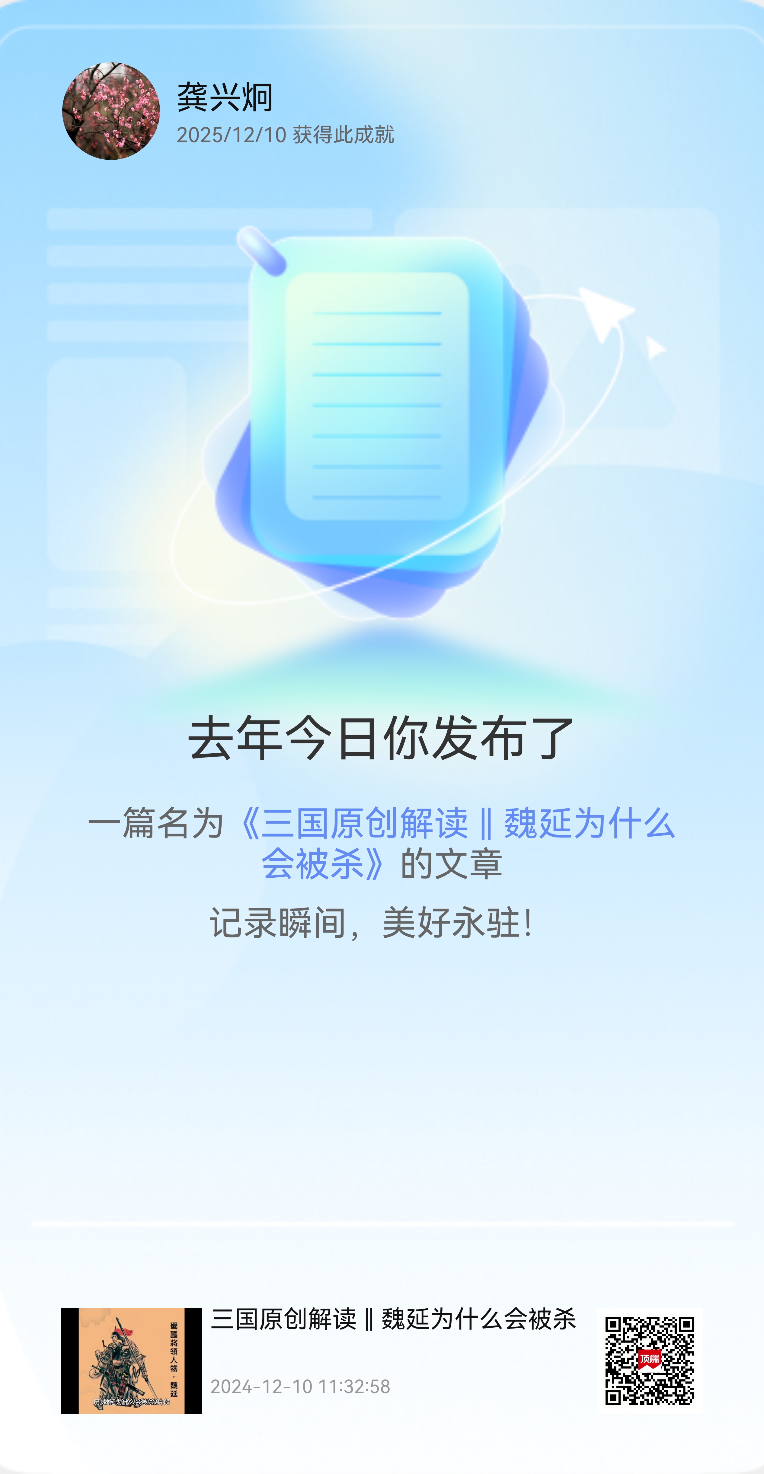 去年今日我在頂端發布了《三國原創解讀‖魏延為什么會被殺》!