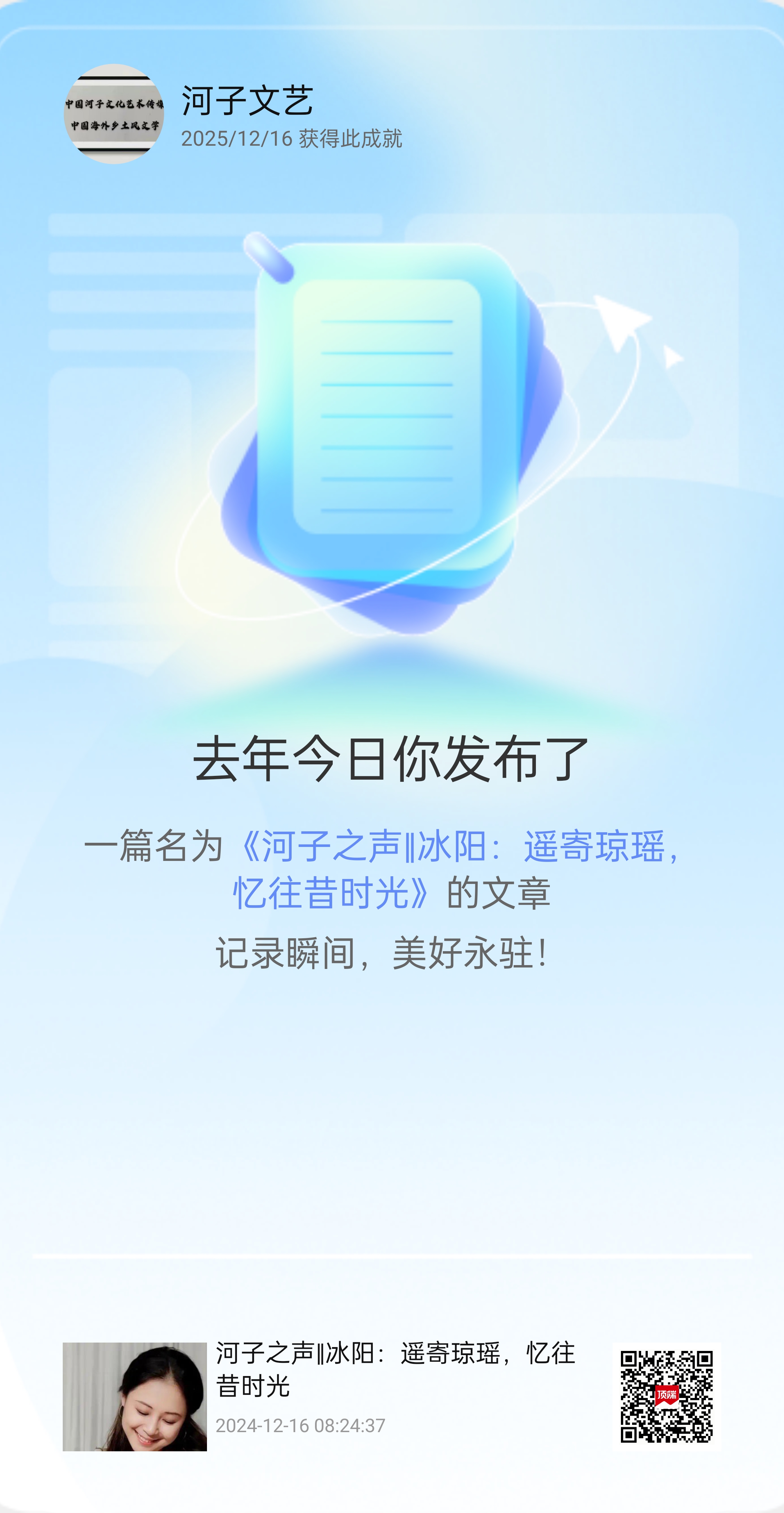 去年今日我在頂端發布了《河子之聲‖冰陽:遙寄瓊瑤,憶往昔時光》! 歲月熔煉才情,日子沉淀心聲!