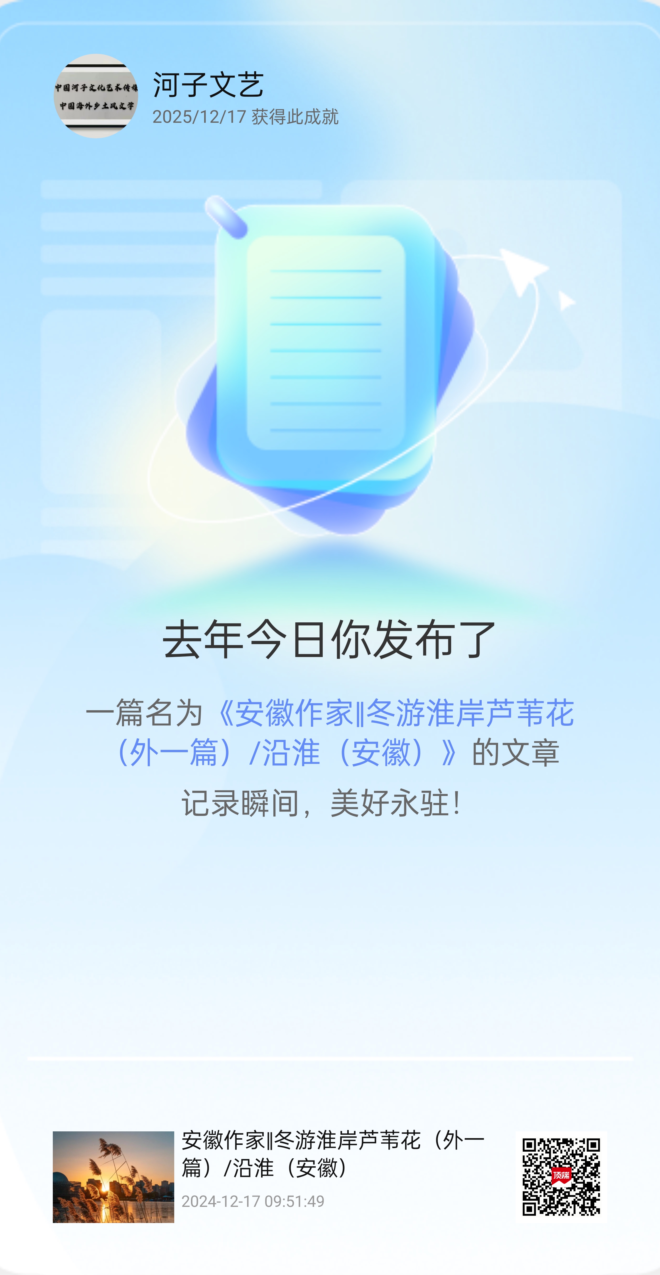 去年今日我在頂端發布了《安徽作家‖冬游淮岸蘆葦花(外一篇)/沿淮(安徽)》! 記錄生活記錄日子!藝術綻放青春影……