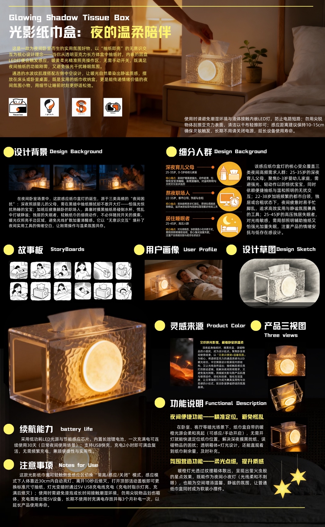 當深夜育兒的媽媽摸黑抽紙時,不用摸索開關,指尖觸碰到紙巾的瞬間,暖光已隨抽紙動作自然亮起;當加班晚歸的職場人在昏暗客廳落座,抬手抽紙的動作,恰好讓柔光燈圈溫柔包裹桌面——這就是我們以“無意識設計”為核心,打造的「光影紙巾盒」。