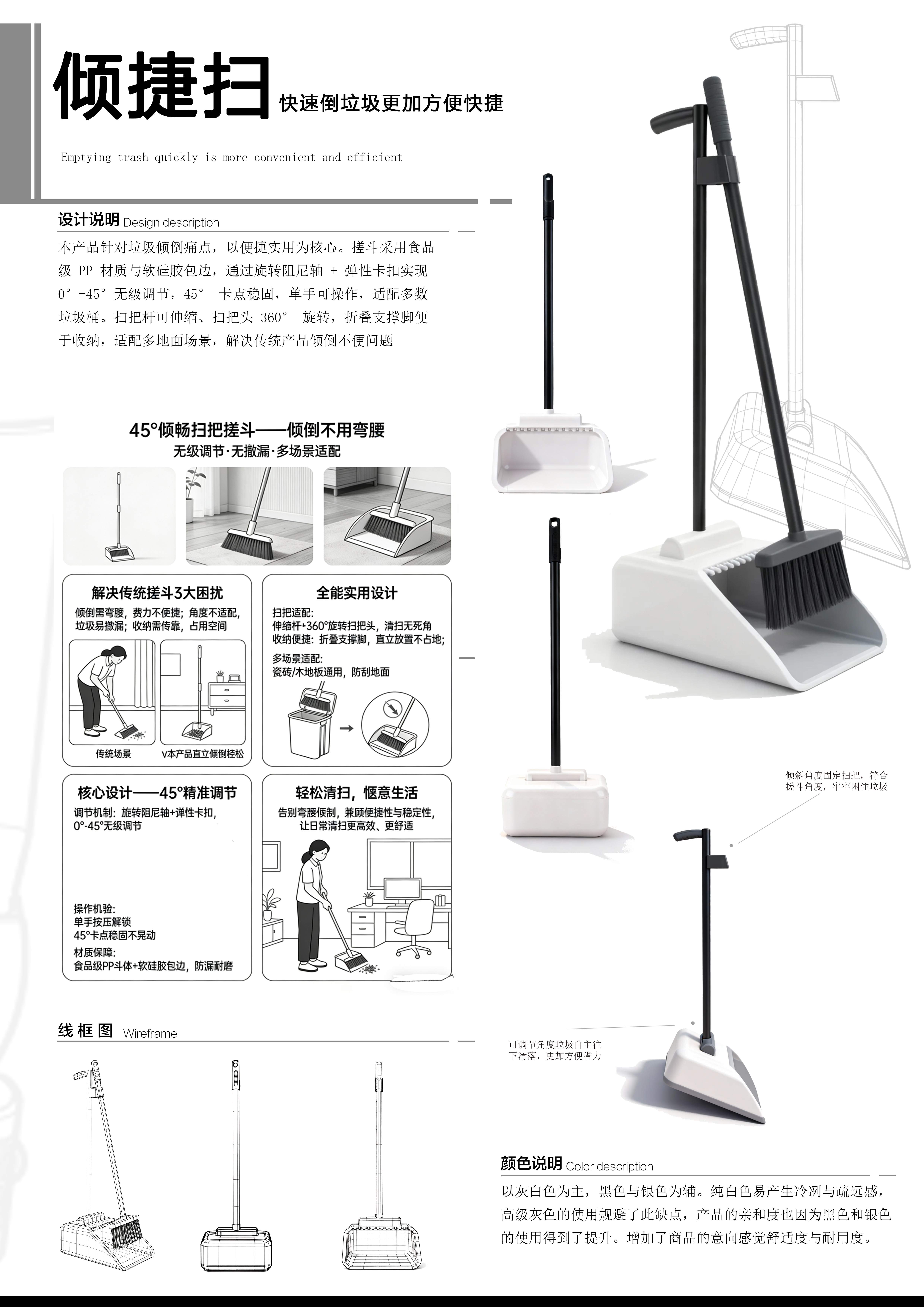 本產品聚焦垃圾傾倒不便的核心痛點,以 “精準調節、便捷實用” 為設計核心。搓斗采用食品級 PP 材質與軟硅膠包邊,搭配旋轉阻尼軸 + 彈性卡扣調節機構,支持 0°-45° 無級調節,45° 卡點定位穩固,單手即可完成傾斜操作,適配多數垃圾桶高度,傾倒無撒漏。掃把桿可伸縮、掃把頭 360° 旋轉,搓斗底部折疊支撐腳方便直立收納。整體符合人體工學,兼顧瓷磚、木地板等多場景使用,既解決傳統搓斗傾倒彎腰、殘留的問題,又保持日常清掃的實用性與穩定性。