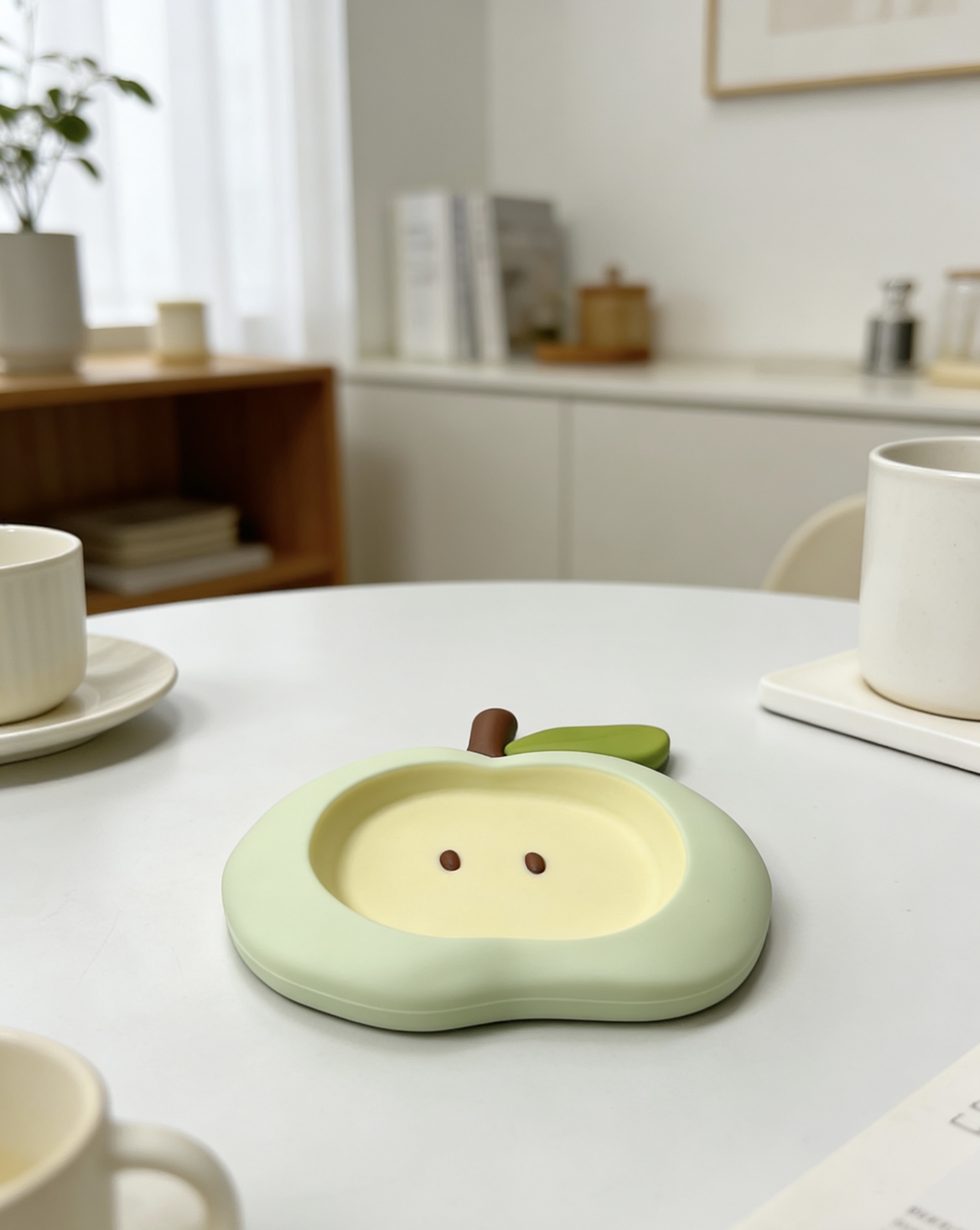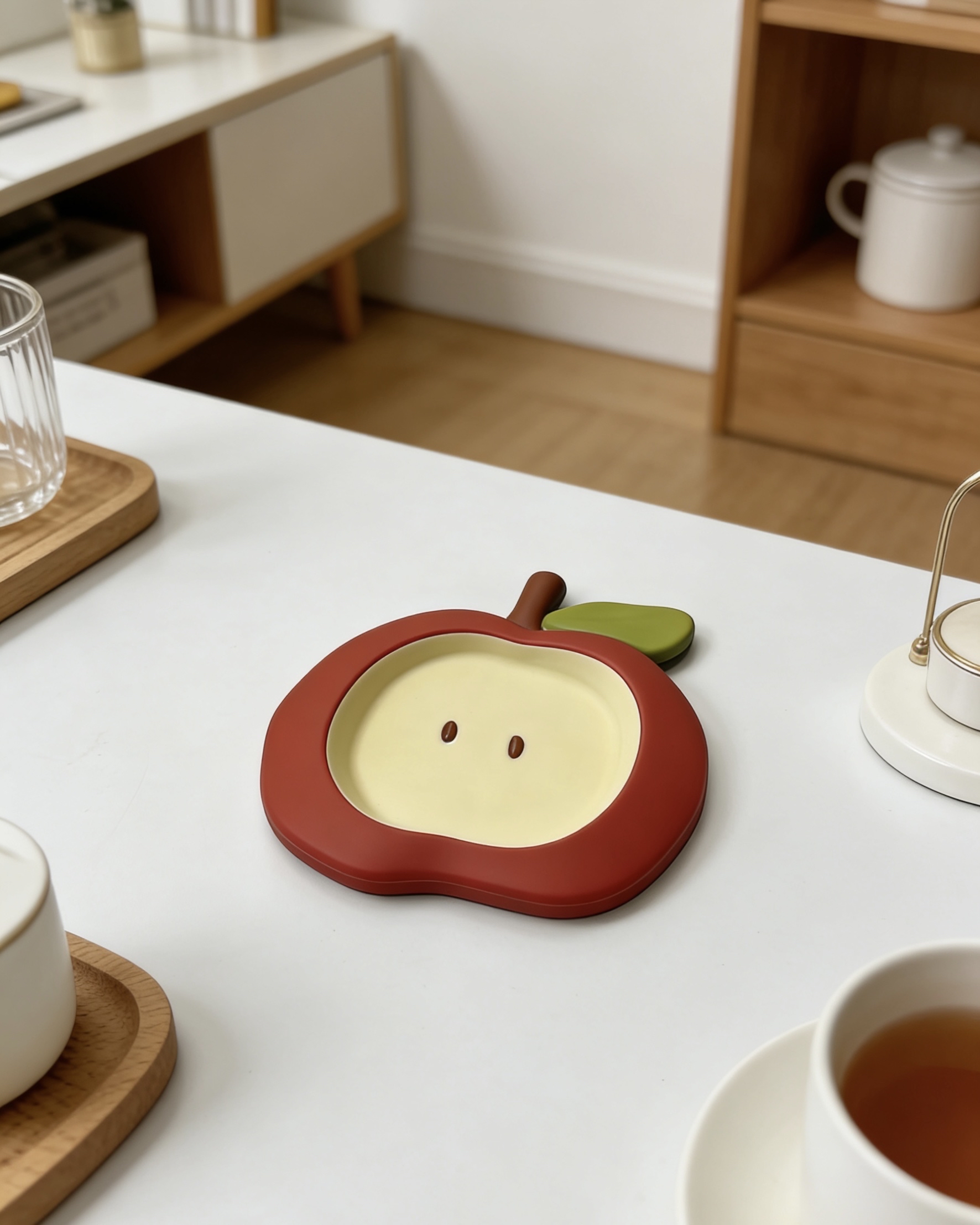 杯墊采用“蘋果切片”的立體造型,搭配果核紋理,強化“真實蘋果”的辨識度;溫變過程中僅改變外殼色彩,內部果肉紋理保持統一,既保證視覺連貫性,又突出“色彩漸變”的核心亮點。