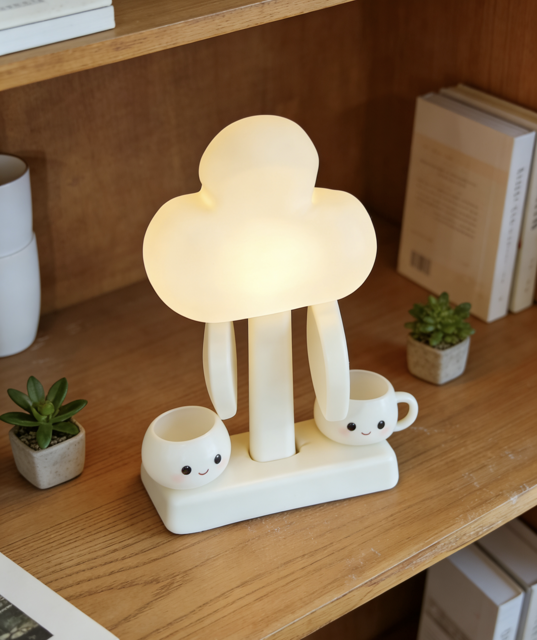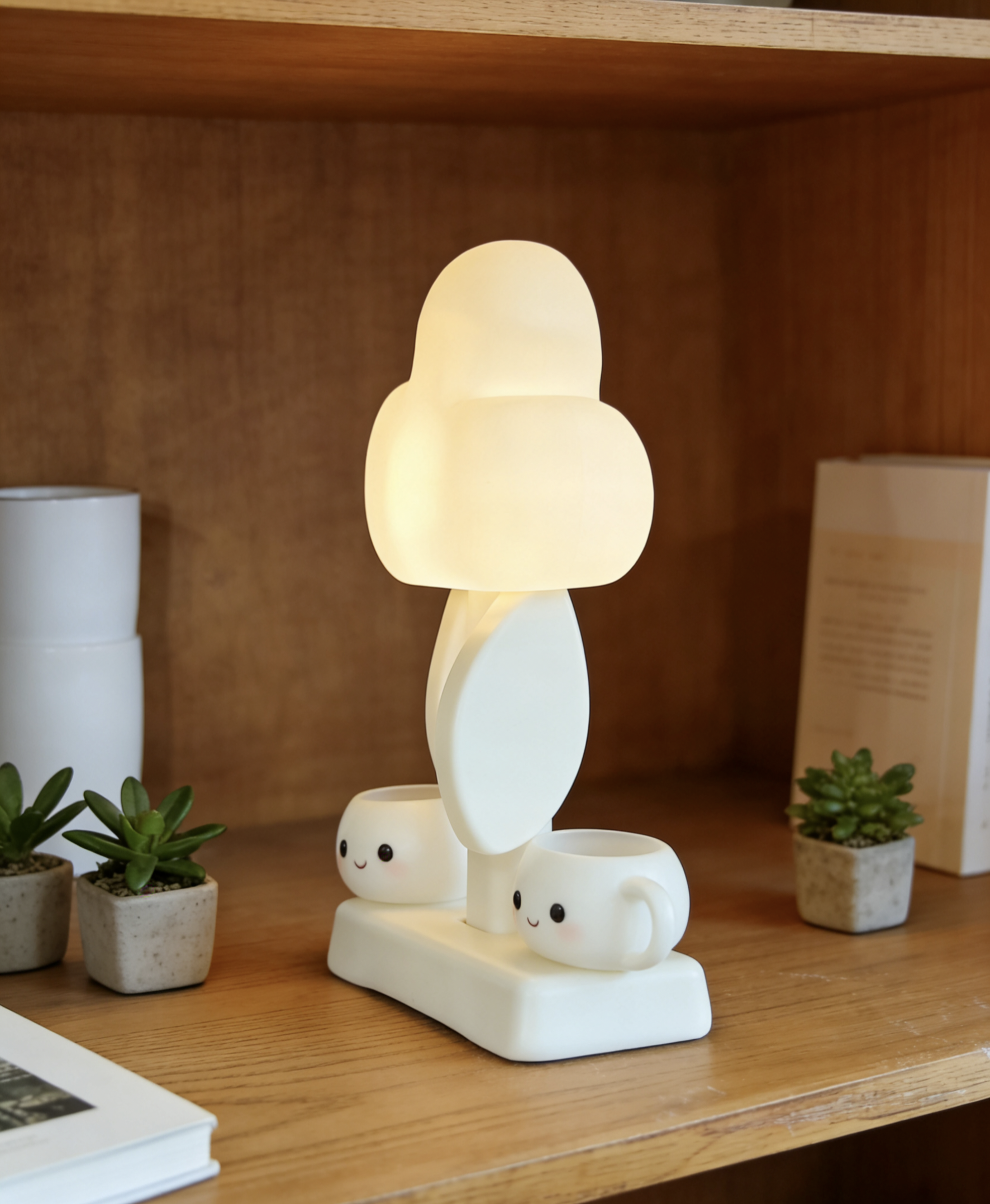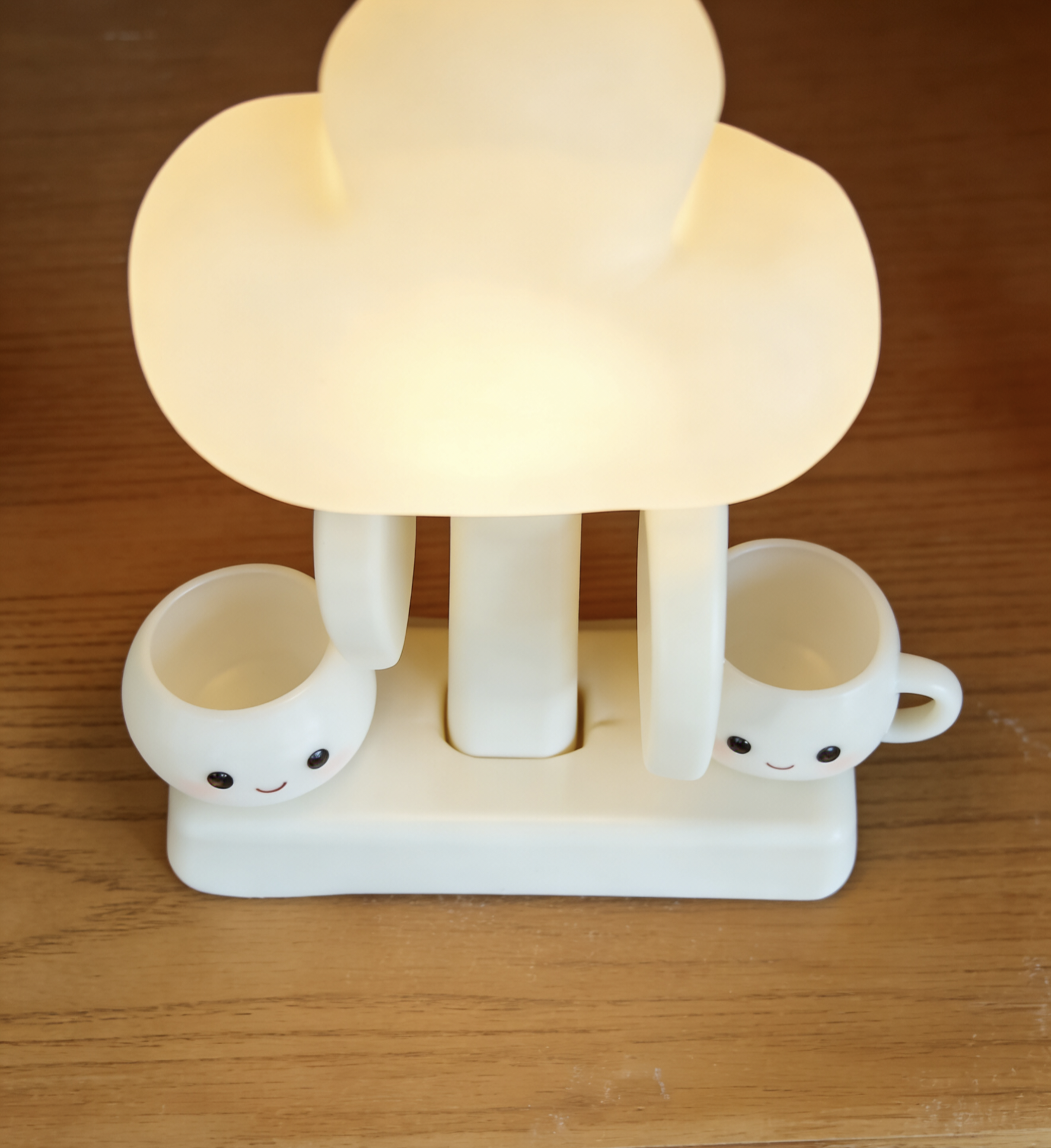 它的主體采用半透明磨砂塑料材質,頂部是云朵造型的柔光燈罩,點亮后透出溫潤的暖光,兼具照明與氛圍營造效果;中間的“雨滴”立柱既是裝飾,也可作為燈的開關(通過取放杯墊觸發);底部搭配兩個陶瓷材質的卡通杯子,杯身印著軟萌笑臉,既實用又能提升可愛感。