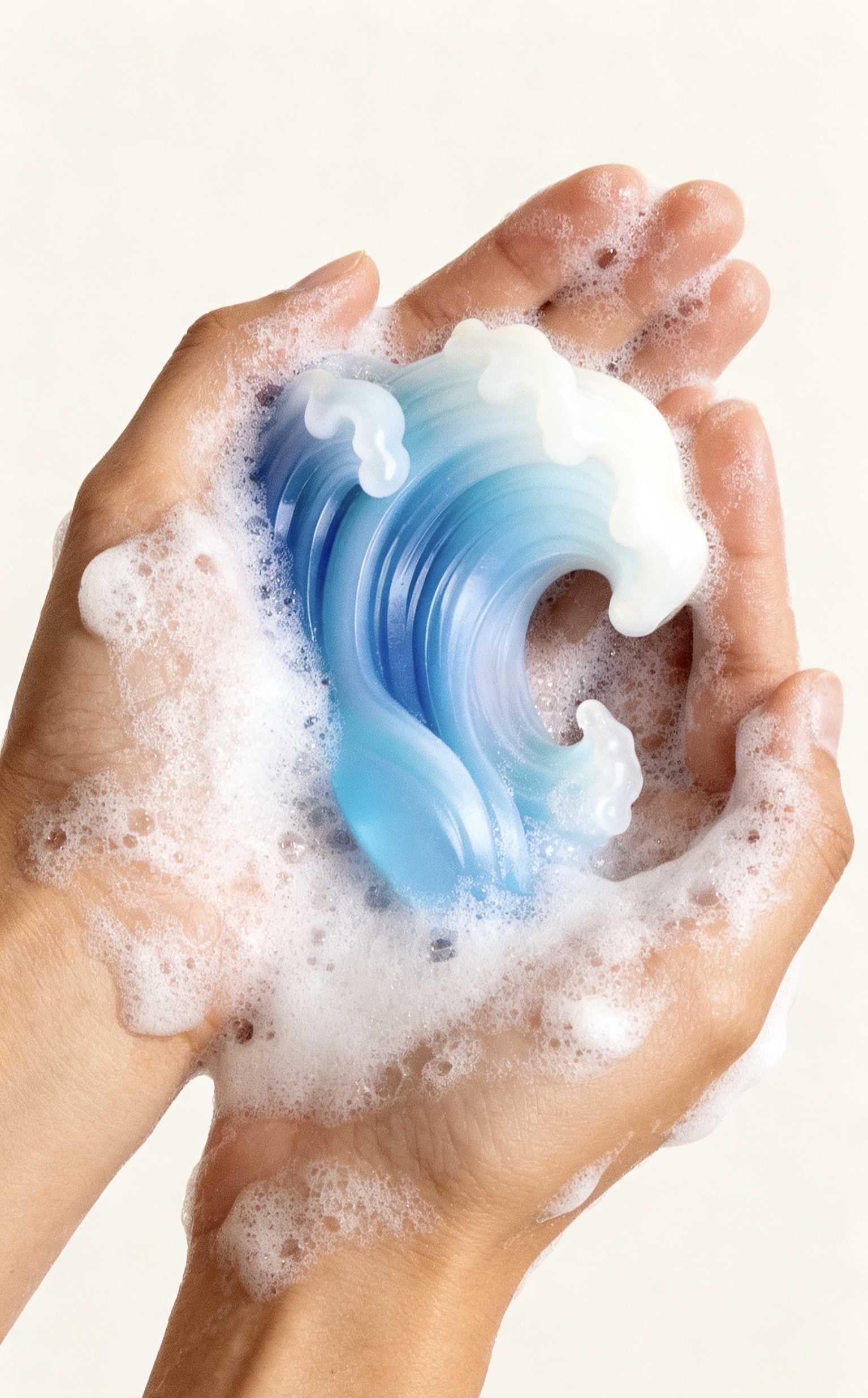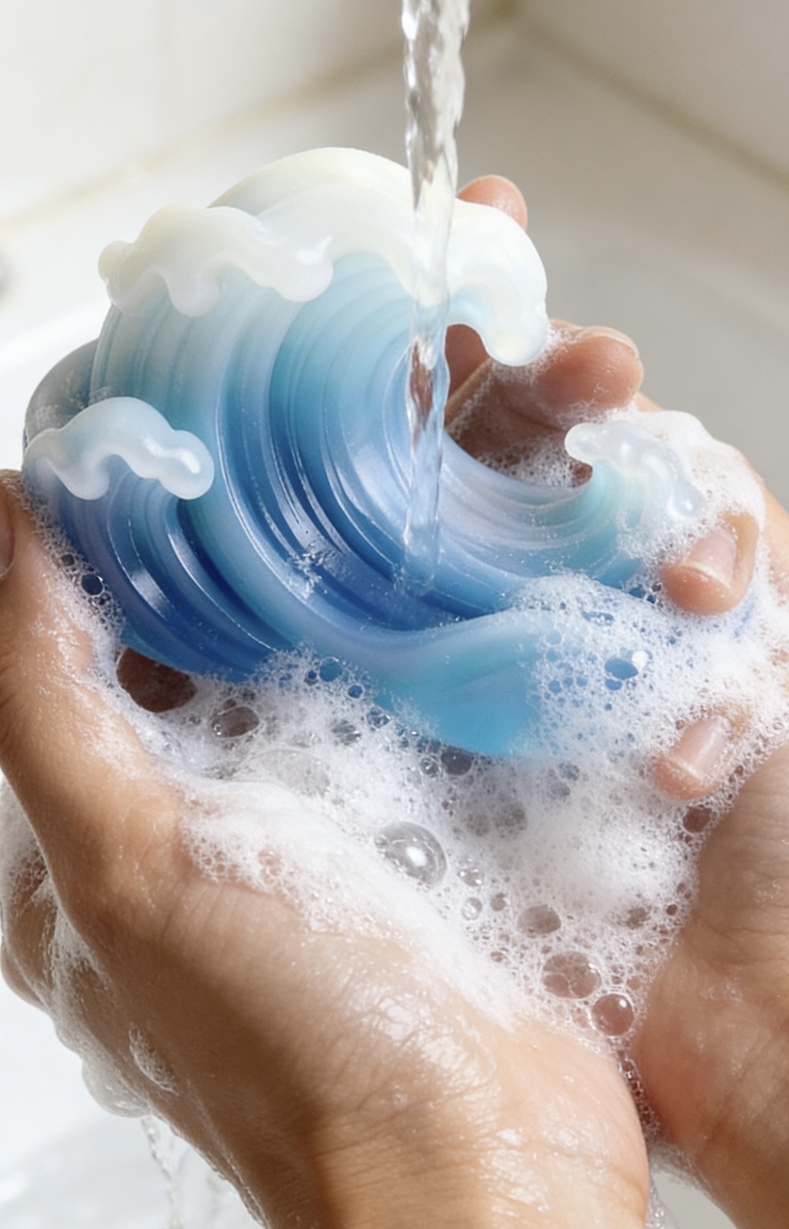 產品直擊傳統香皂殘余10%-15%小塊因難以握持被丟棄的痛點,在皂體中心嵌入同形海浪模玩,用戶無需刻意學習,會在皂體漸小時本能握持擺件,無意識間將皂體利用率提升至100%,從根源消解資源浪費。其仿生海浪外形,在高頻洗漱場景中以視覺符號隱性傳遞海洋保護理念,讓環保認知隨使用習慣自然扎根,規避說教式理念灌輸。