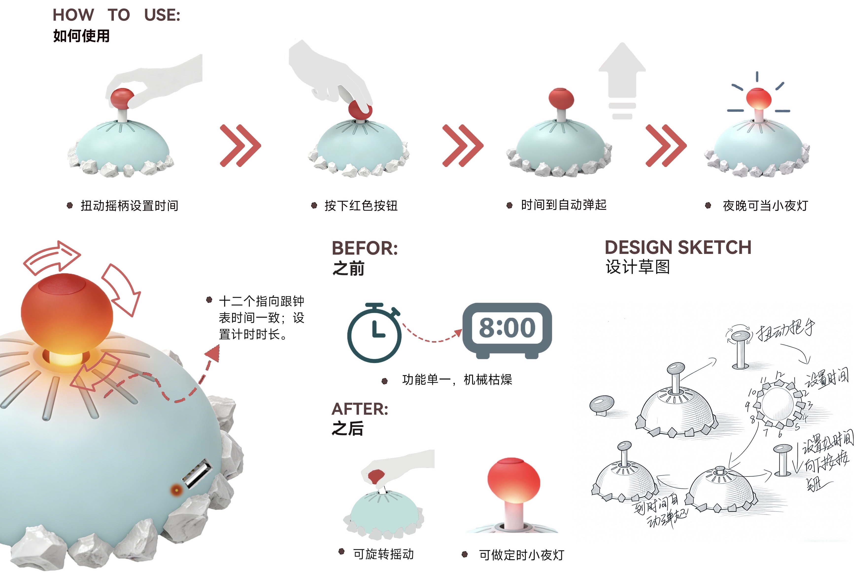 體驗:日常中的趣味儀式感;這款設計的巧思,在于讓“計時”這件日常小事變得有溫度:當用戶隨手搖動紅色球體,既是完成定時操作,也是一場輕松的互動游戲;夜間球體亮起的柔光,既是照明工具,也成為空間里的氛圍點綴。它以“地雷”的反差感打破產品的刻板印象,又以無意識的互動邏輯降低使用門檻,最終讓實用工具跳出功能本身,成為能傳遞趣味與松弛感的生活陪伴者。