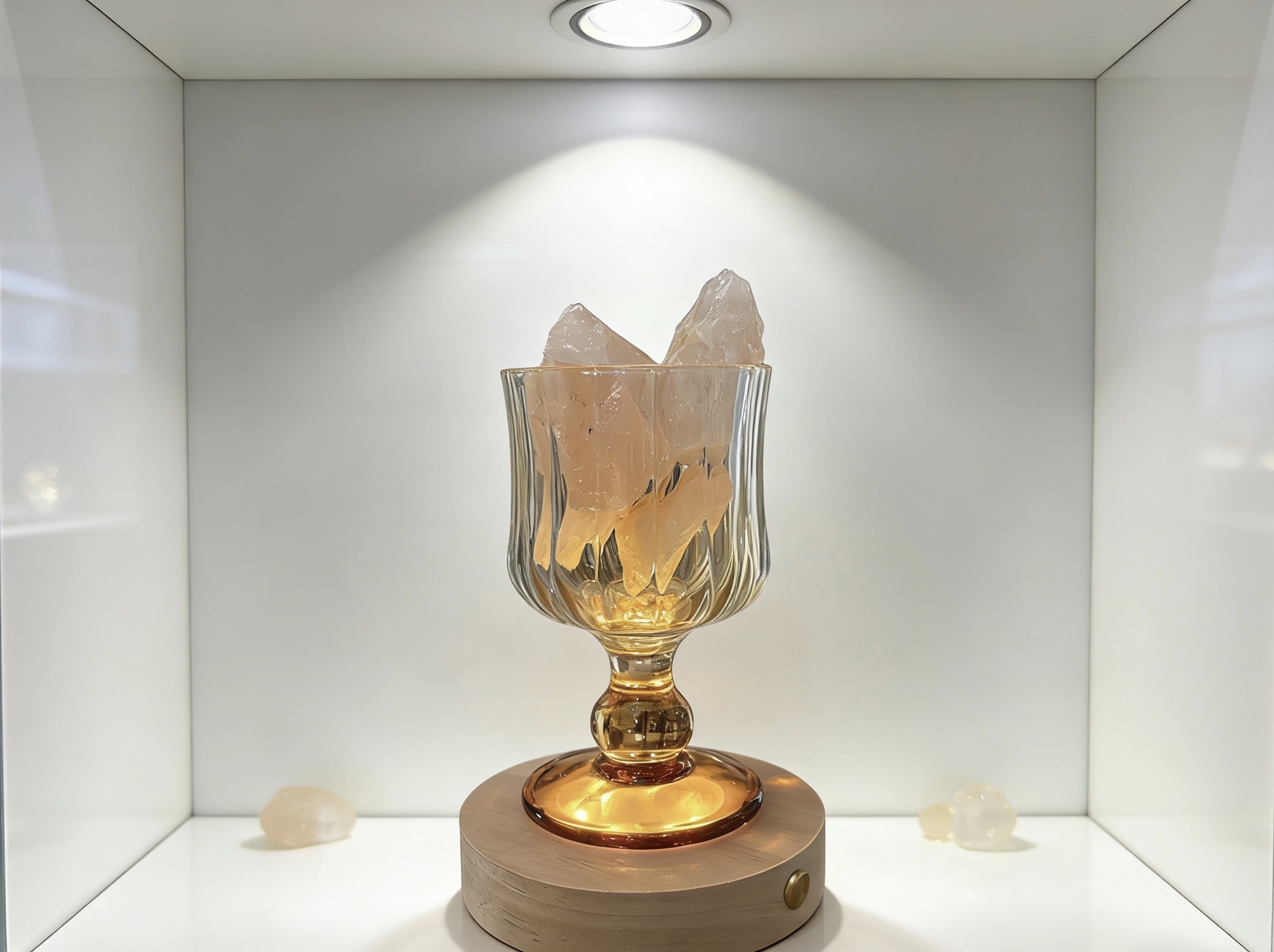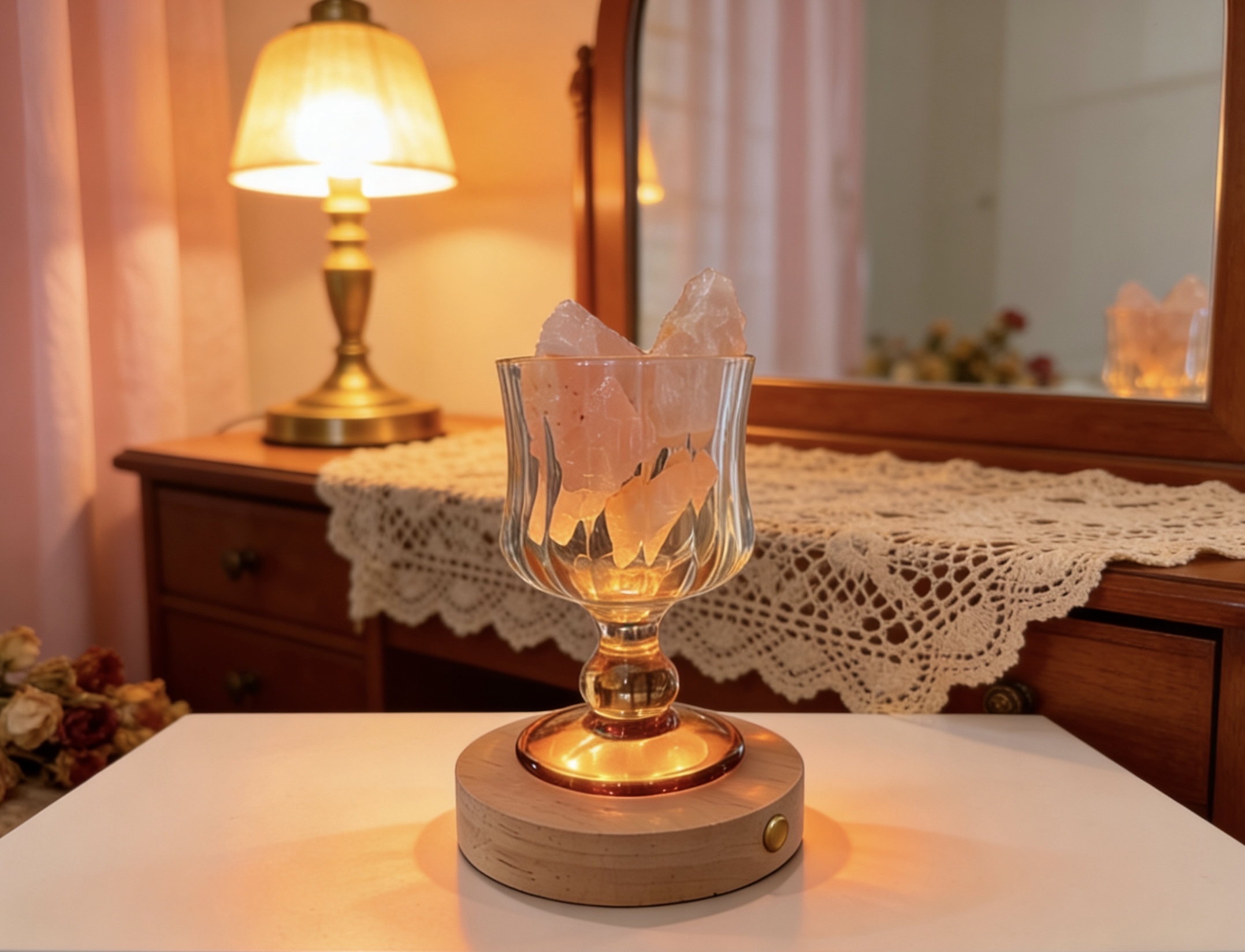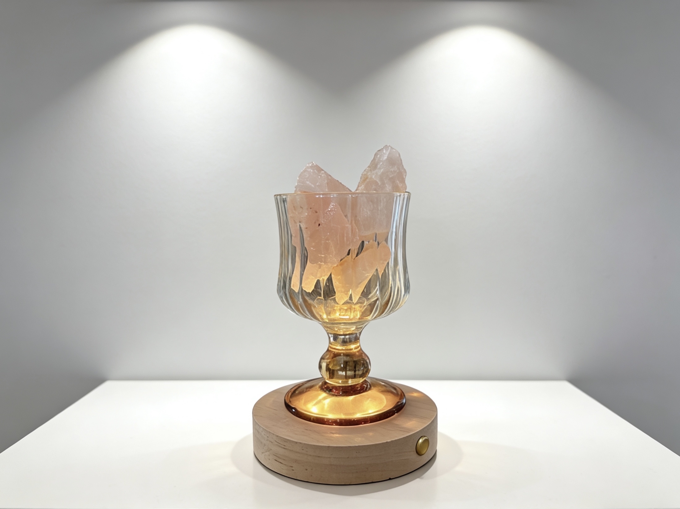 本款香薰以「自然療愈+家居美學」為核心,采用水晶玻璃高腳杯搭配天然粉水晶原石,木質底座中和冷感,兼具裝飾性與實用性。整合香薰、氛圍燈、小夜燈功能,暖光透過晶石折射出柔和光影,結合粉水晶的療愈意象,打造多感官放松的使用體驗。