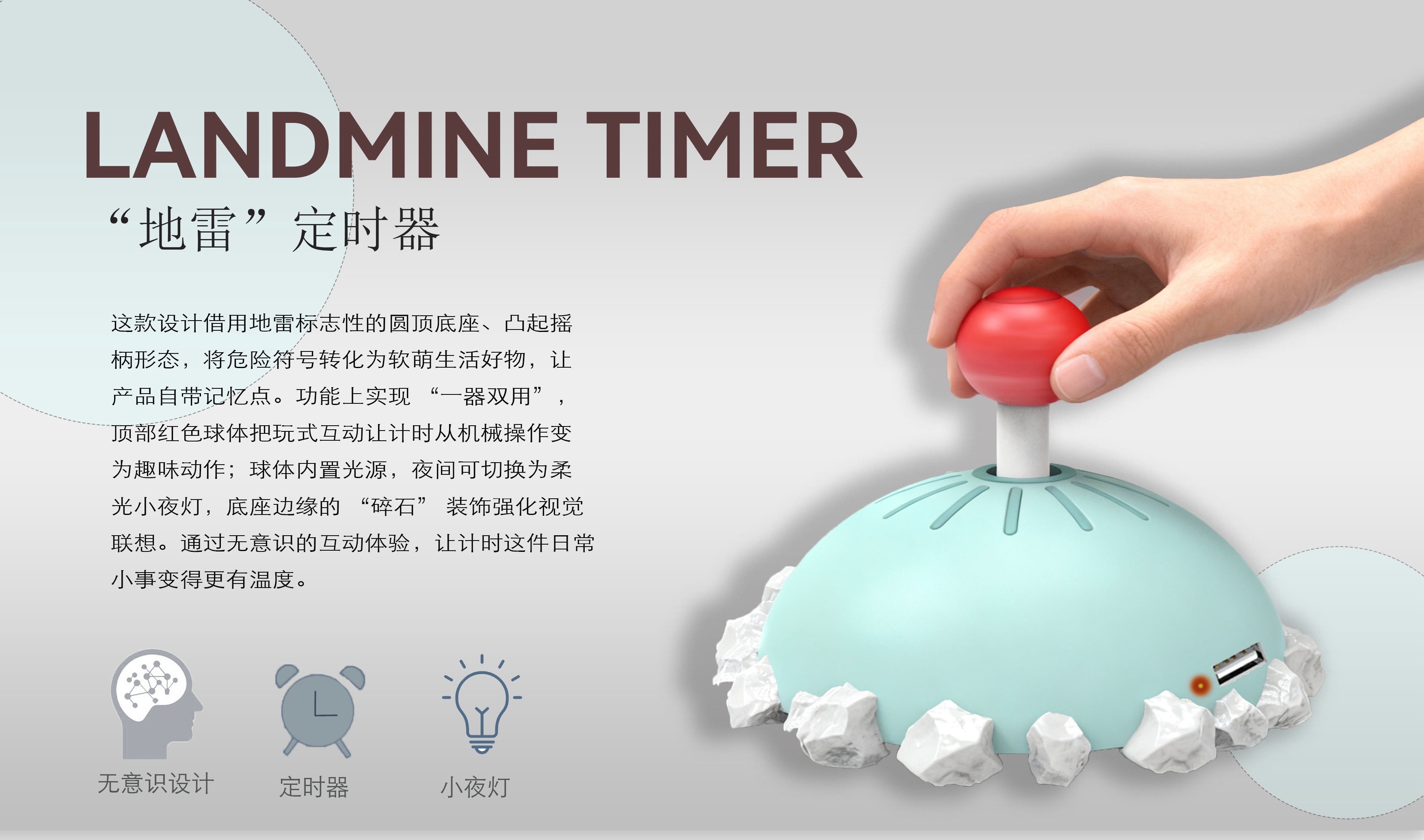 這款“地雷”定時器,是將 “無意識設計”。理念與生活實用工具結合的創意產物。它以大眾熟知的“地雷”形態為視覺原型,通過柔化危險符號、融入趣味互動,讓日常計時工具跳出刻板框架,成為兼具情緒價值與實用功能的生活好物。