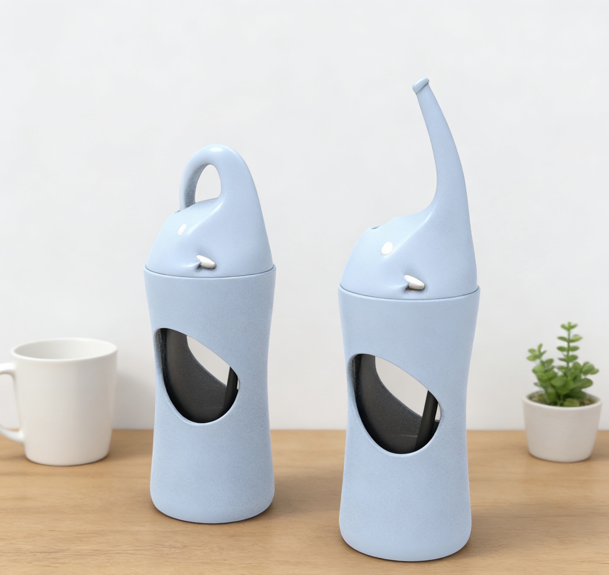 2. 仿生造型+人體工學抓握:杯身采用大象仿生造型,鏤空處形似大象耳朵,貼合兒童小手抓握弧度,孩子握持更穩固;杯蓋閉合時的彎曲部位可當作提手,開合后頂端突出部分能卡入固定,兼具趣味性與實用性。