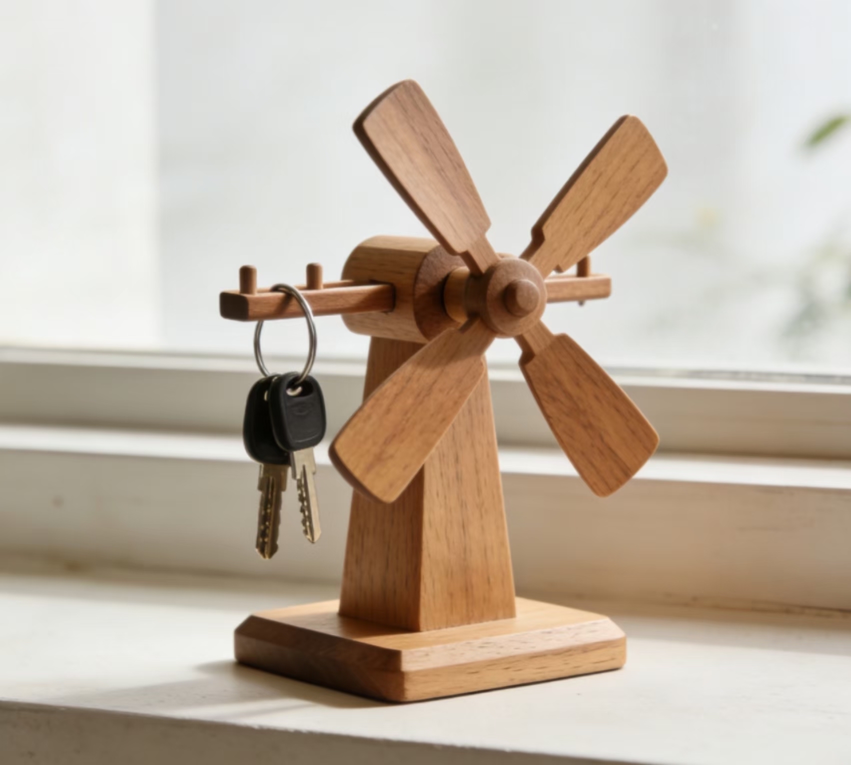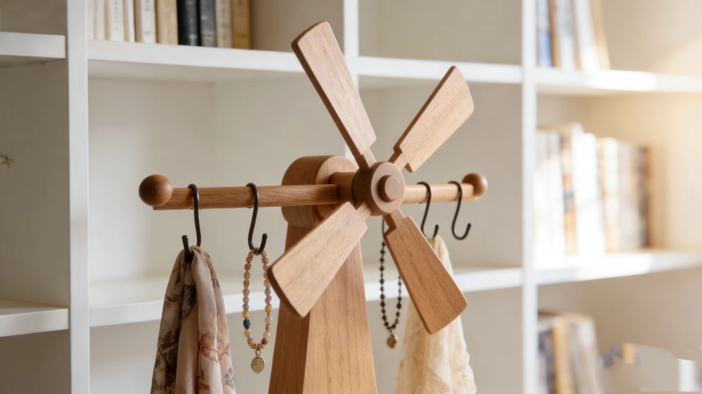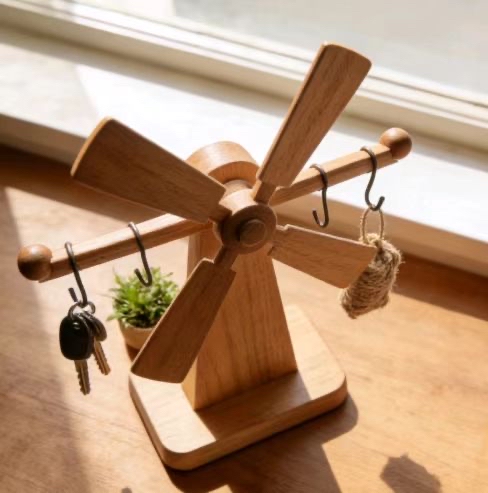 這款風車造型可旋轉掛物架,以簡約木質打造,主體呈風車形態,底座穩固。其葉片可靈活旋轉,兼具裝飾與實用功能。設計上融入自然美學,適配多種家居風格,放置于窗臺、桌面等,既似微型景觀增添空間生機,又能懸掛小物件,利用旋轉特性方便取用。材質環保,工藝精細,在滿足收納需求的同時,為生活空間注入趣味與藝術感,是家居裝飾與實用收納的巧妙結合。