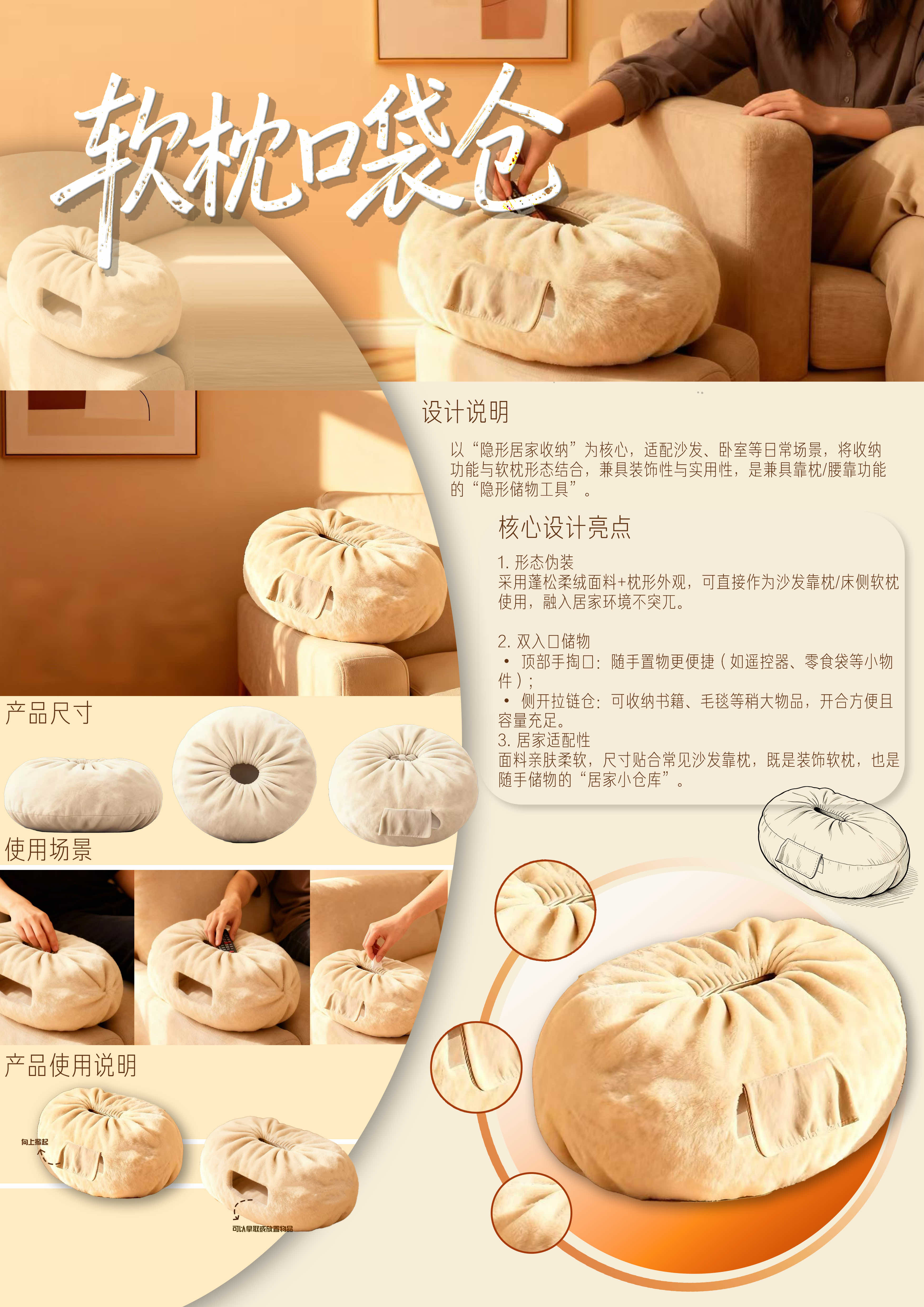 本產品以“空間整合,舒適兼具”和“無意識設計”為核心設計理念,將沙發靠枕的實用功能與收納需求深度融合,打造小戶型家居的高效解決方案。