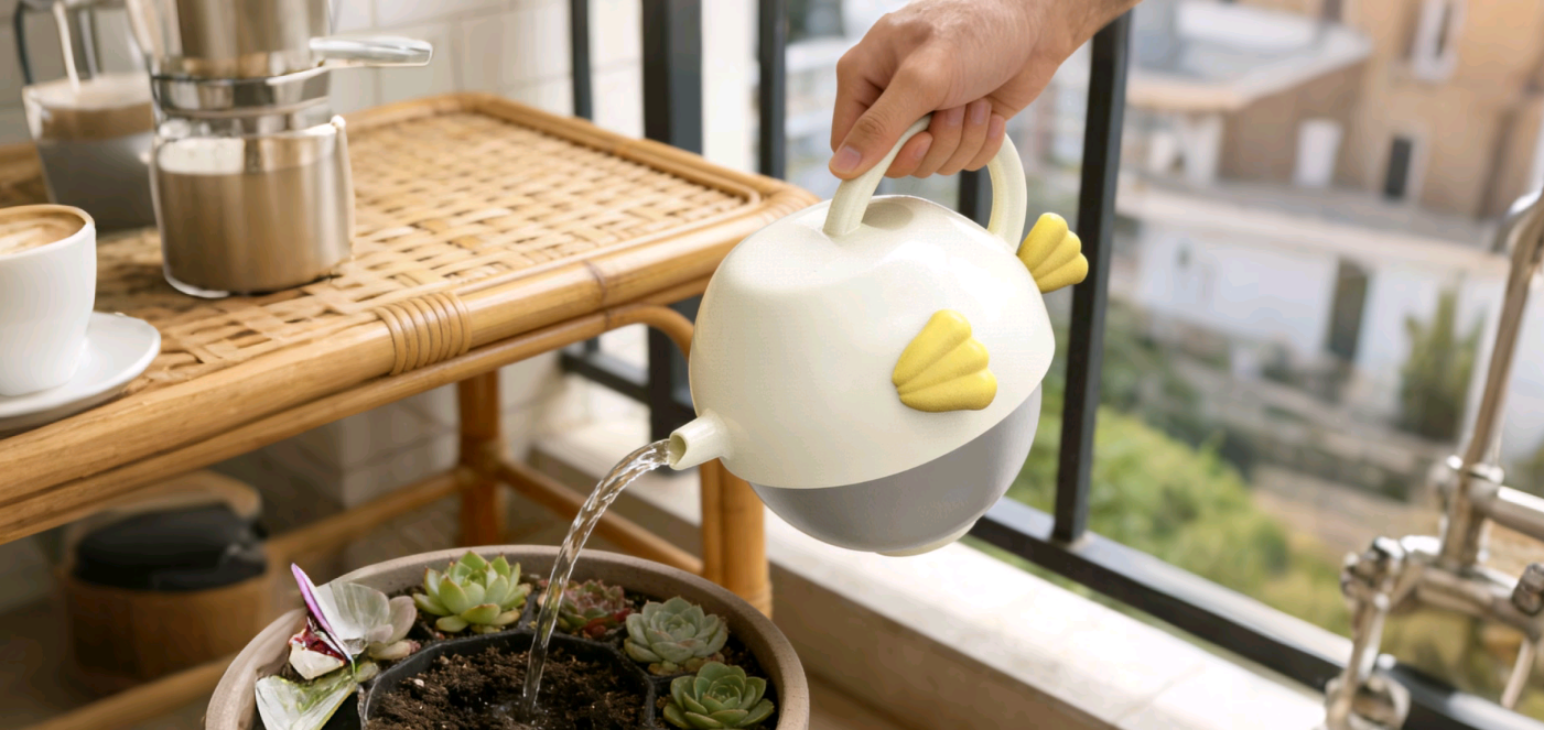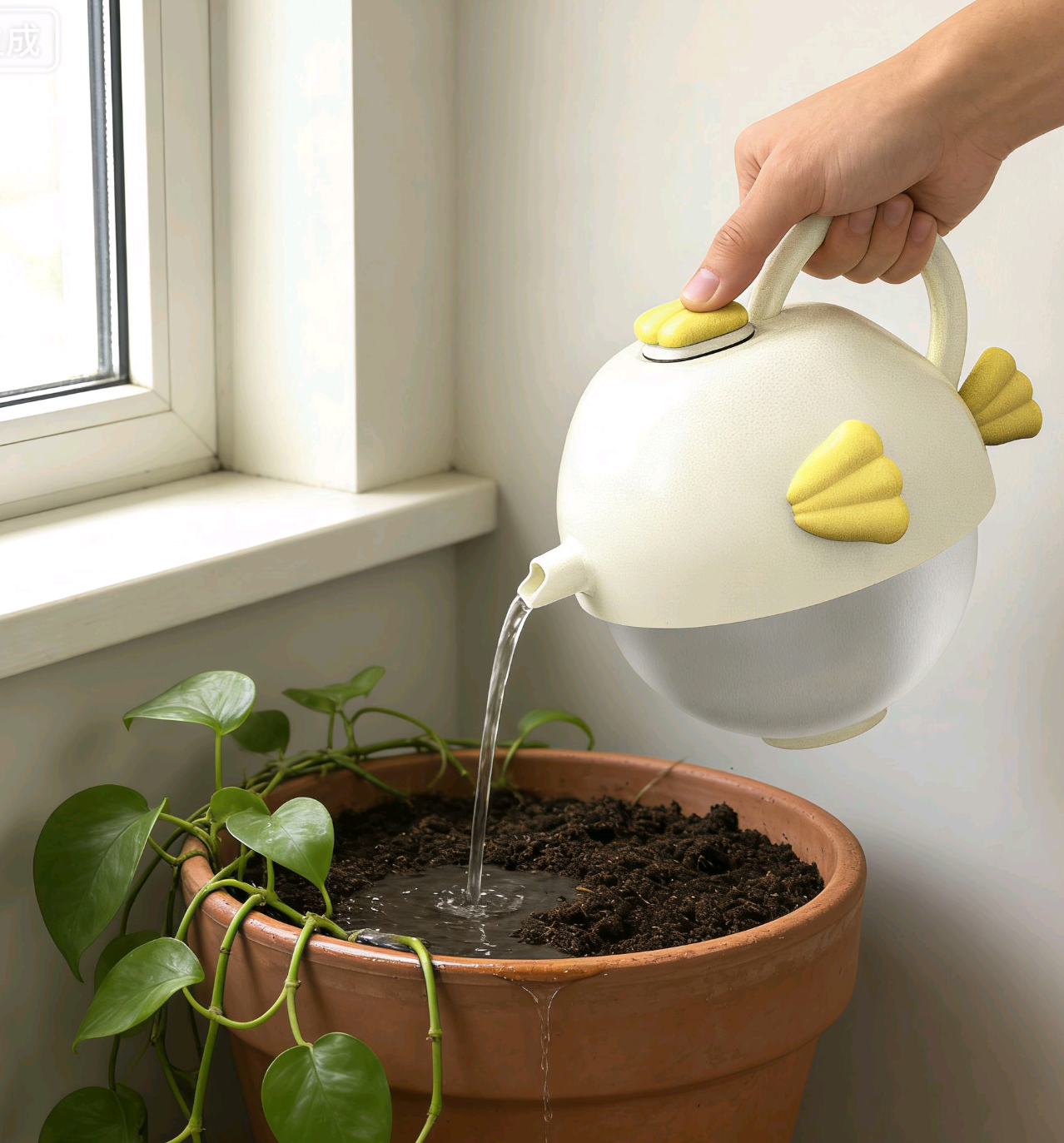 色彩搭配上選用清新柔和的黃色系,既呼應綠植生長的自然氛圍,又延續河豚自帶的鮮活質感,讓澆水壺在居家、陽臺等場景中既能作為實用工具,也能成為空間裝飾亮點,提升場景視覺協調性。細節處融入簡約紋理裝飾,模擬河豚體表細膩肌理,既豐富視覺層次,又增強握持時的防滑性,兼顧美觀與實用,讓每一處設計都服務于使用需求,實現形態靈感與功能需求的平衡,讓灌溉過程更具愉悅感與便捷性,傳遞自然與生活相融的設計理念。