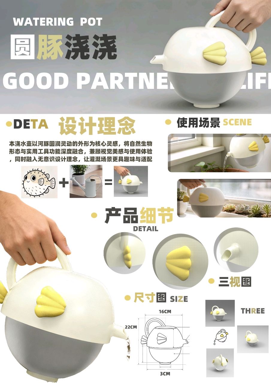 設計在形態上提取河豚鼓脹的橢圓軀體輪廓,打造壺身主體,線條流暢飽滿,既保留生物形態的親和力,又保證壺身充足的儲水容量,貼合日常灌溉時的水量需求;壺嘴借鑒河豚尖俏的吻部造型,采用傾斜弧度設計,出水流暢集種。