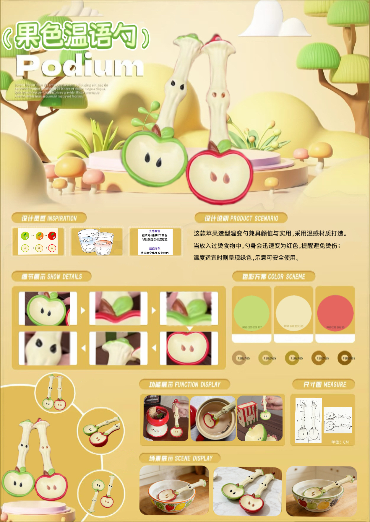 “果色溫語勺”以蘋果為核心造型靈感,結合溫感變色材質打造兒童專用輔食勺,兼具童趣顏值與實用安全性能。設計初衷源于兒童進食時被高溫食物燙傷的常見問題,同時針對傳統輔食勺造型單調、功能單一的痛點,將自然水果形態與智能溫感技術融合,讓餐具成為守護孩子飲食安全的“小衛士”。