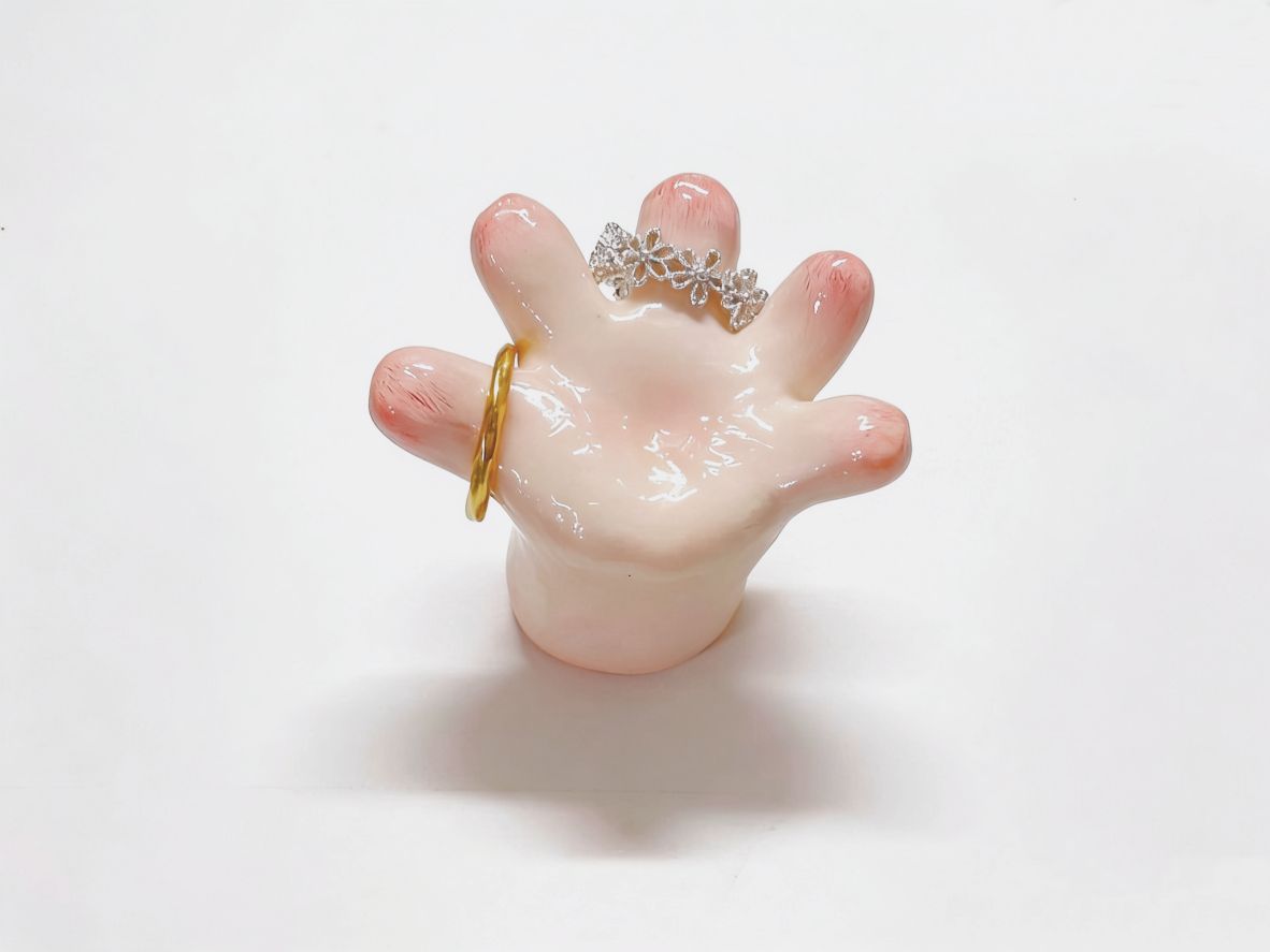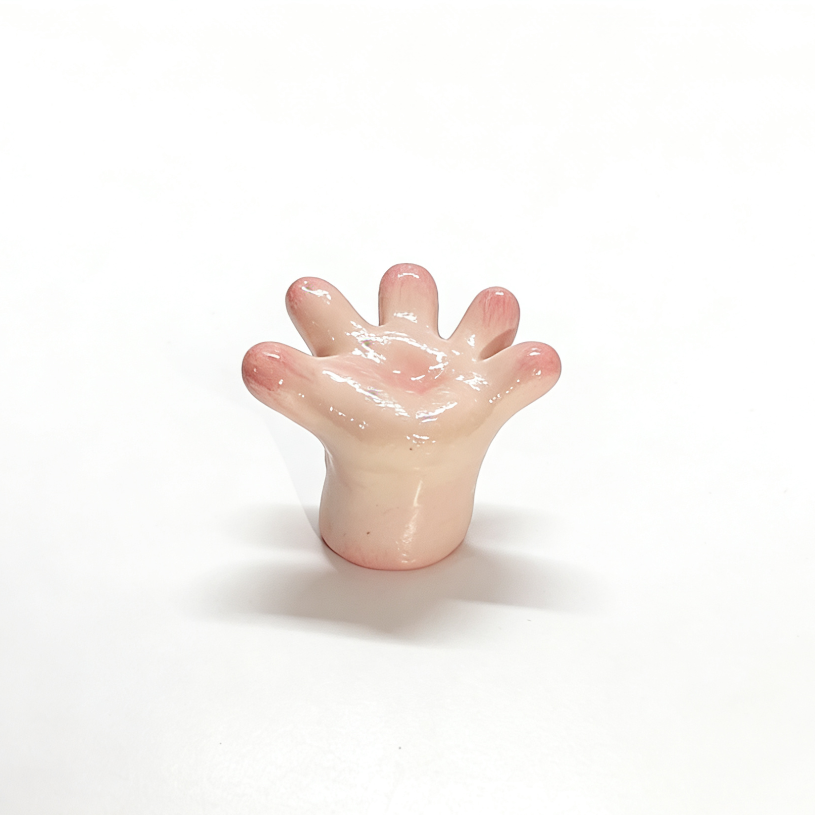 主體以《星期三》Thing的手部輪廓為原型,還原自然手掌比例,保留指節凸起、掌心凹陷等細節,強化手部造型的辨識度與立體感;摒棄原作的干枯質感,采用圓潤線條處理指尖與邊緣,弱化鋒利感,適配家居裝飾的柔和氛圍;主色選用低飽和奶油粉,替代原作的冷灰黑色,指尖點綴淺粉漸變,既呼應少女感家居風格,又通過色彩對比保留手部造型的視覺焦點.