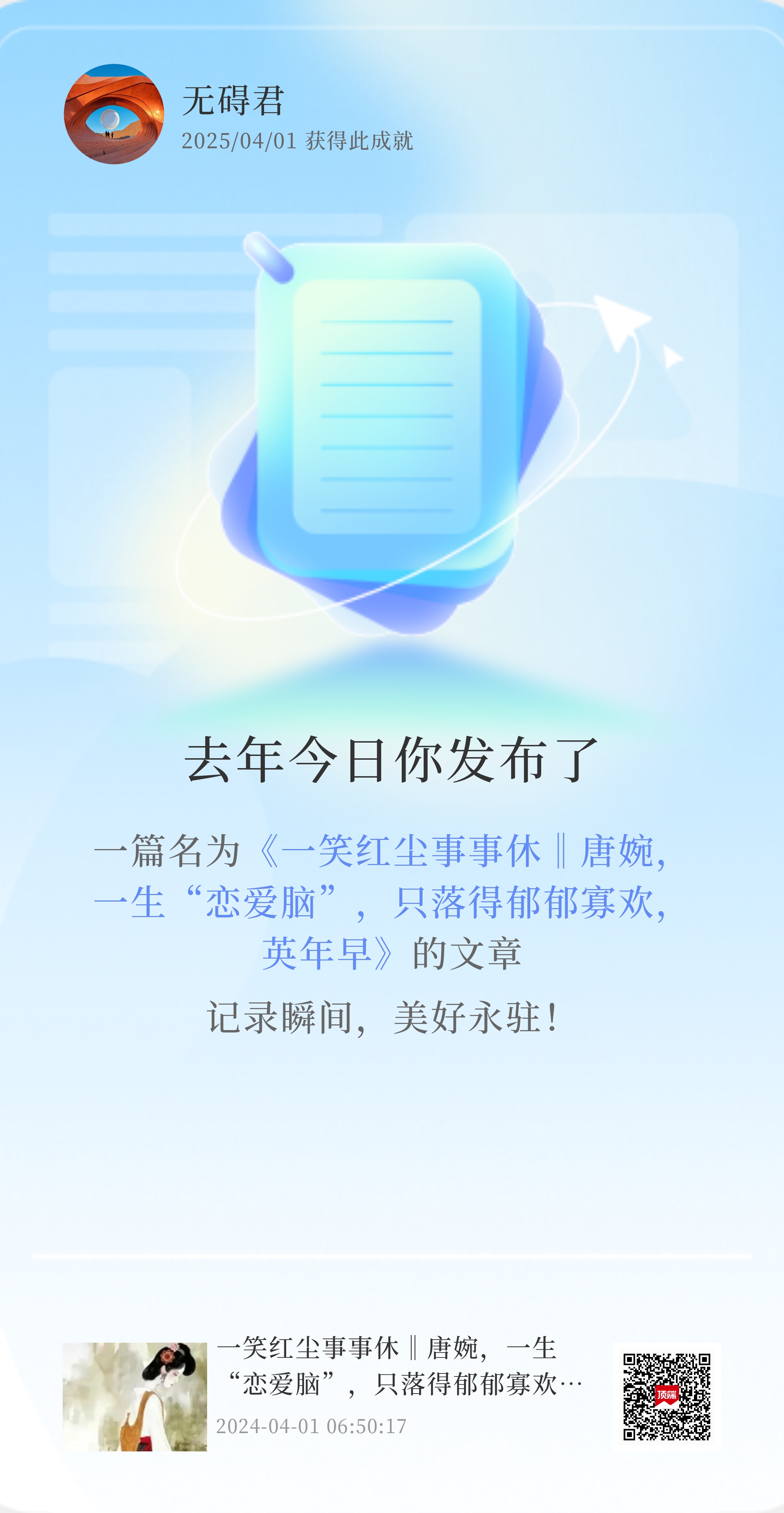 去年今日我在頂端發布了《一笑紅塵事事休‖唐婉,一生“戀愛腦”,只落得郁郁寡歡,英年早逝》!