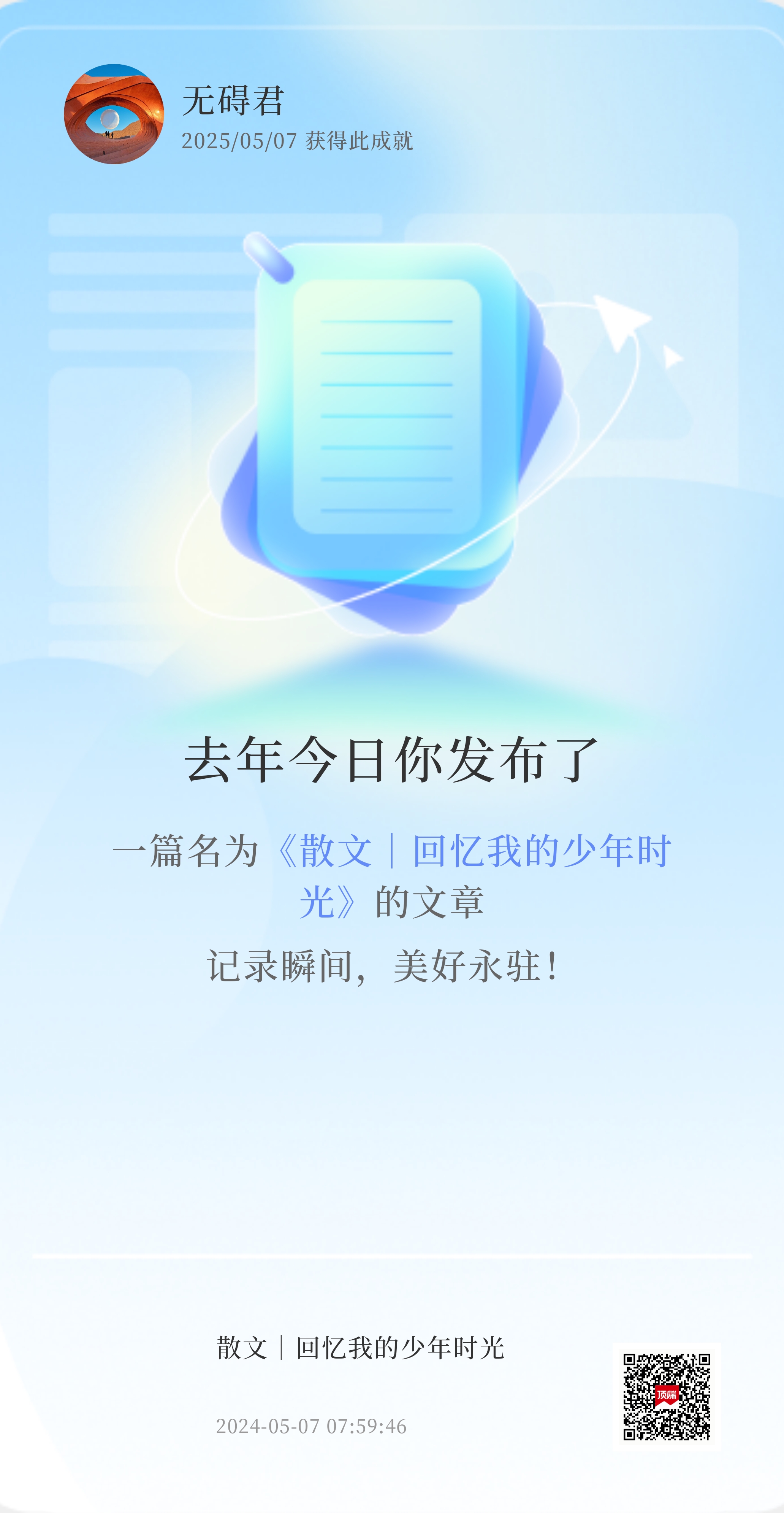 去年今日我在頂端發布了《散文|回憶我的少年時光》!