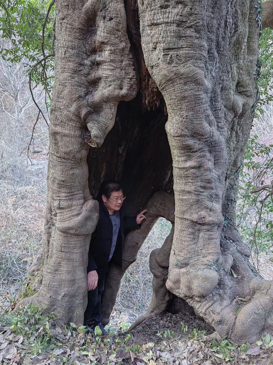 這里地處偏僻,山高林密,人跡罕至,為古樹的茁壯成長提供了必要的條件,至少是少了人類的戕害。數百年來,大古樹猶如巨人靜靜地佇立在巨石上,默默的忠實地守望著這片山川大地。它歷經雨雪風霜,閱盡了人世滄桑,雖然“心”已腐爛~主干中空,形成了可容納五、六個成人并立的大洞,但它在幾個世紀里櫛風沐雨,以頑強的生命力,得日月之精華、山川之靈氣,仍枝繁葉茂,生機盎然。這本身就是個奇跡。