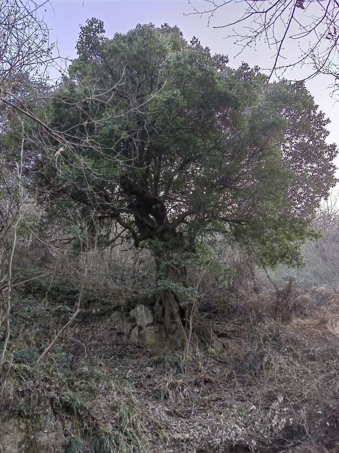 順著大關口的土路往下,向東走約三華里,有一條橫穿土路的小溪,越過小溪左拐,沿著小溪逆流而上穿過一片竹木雜樹林,前行約400百米,就會看見陡峭的山北坡腰部一塊突出的巨石上,高高的挺立著一棵四季常青的大古樹。古樹樹圍5米有余,高約20米,冠幅約20余米。由于生長在巨石上,它很不幸,為了生存,它的虬曲蒼勁的大根緊緊地抓住、包裹著巨石,沿著石壁向下深深扎進泥土里。明顯的可以看出,它的根們依然在繼續頑強地向巨石包圍著、包裹著…。它巨傘似的樹冠層層疊疊,站在樹下,幾乎看不到天空。