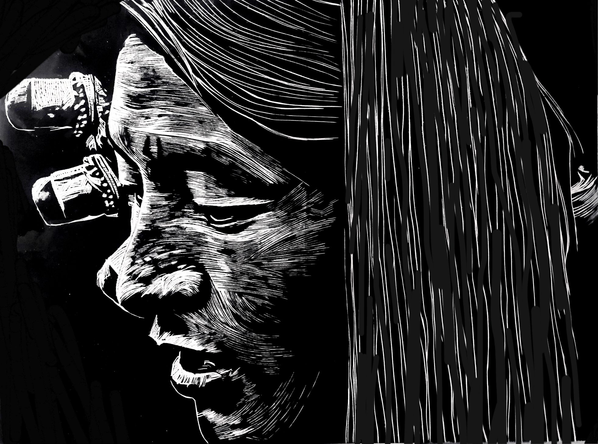畫中人物的“英雄結”垂下發辮,我視之為人生舞臺徐徐降下的幕布。那深紫紅的辮序,是生命絕唱的凝華,是心靈叩響世界時,回蕩在胸腔里的第一聲震顫。我刻下的,不是一張側臉,而是一道讓光線得以穿過、讓觀看者得以窺見自身孤獨的縫隙。黑白之間,再無妥協調和的灰色地帶——正如我所信奉的藝術,不取悅,不解釋,只在極致的對比中,完成自我。