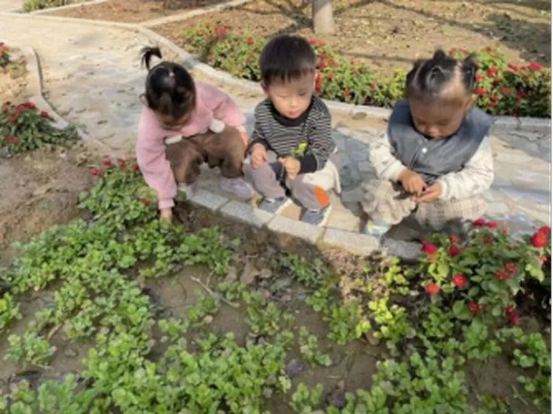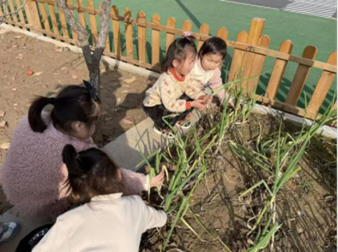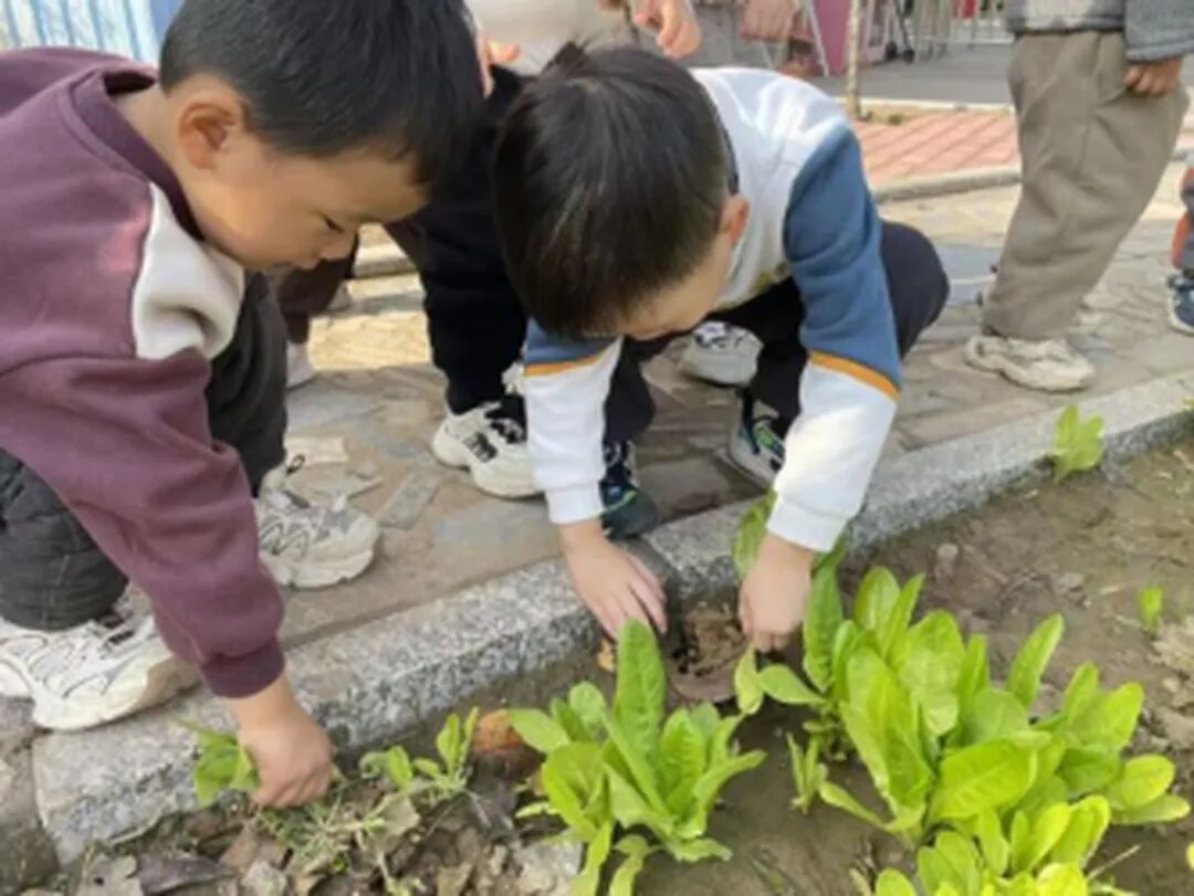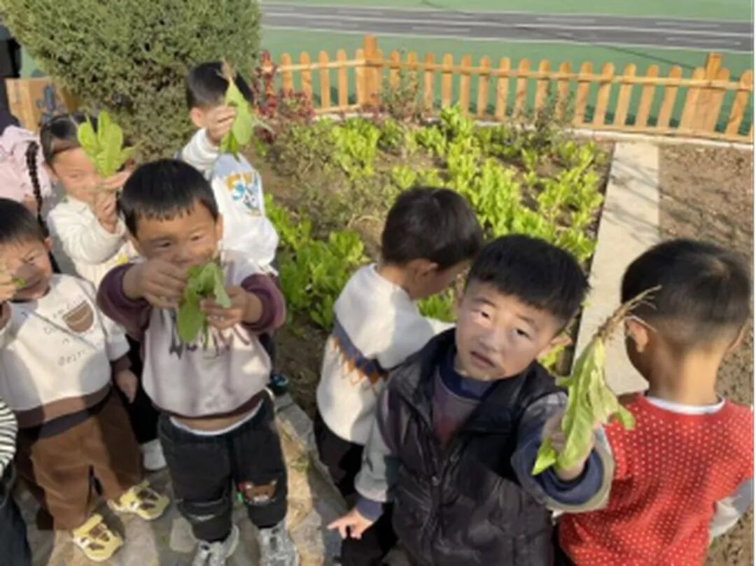 老師牽著孩子們的小手,走到菜園的一角:“孩子們看,這叢葉子碎碎的、聞起來香香的是香菜;旁邊長得直直的、葉子像細帶子的是小蔥;那邊葉子又寬又長、邊緣有點波浪的,就是油麥菜啦?!?孩子們立刻湊了上去,小鼻子湊到香菜旁用力嗅了嗅,有的皺著小眉頭說 “好香呀”,有的忍不住笑出了聲;摘小蔥時,使勁一拽,“?!?的一聲,帶著清新氣味的小蔥就到手了;摘油麥菜時,胖乎乎的小手雖然有些笨拙,卻格外認真。