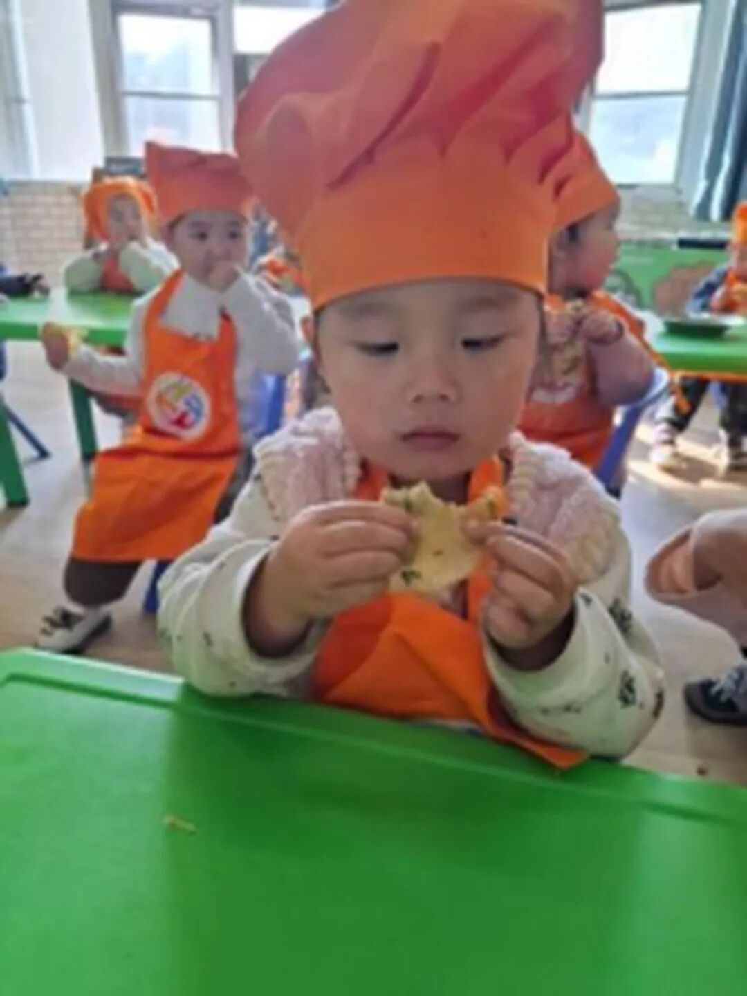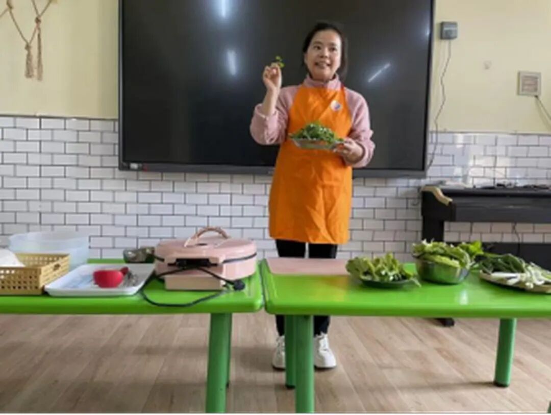 孩子們捧著自己參與制作的煎餅,迫不及待地咬了一口?!巴郏邢悴说南阄?!”“小蔥好香呀,好好吃!”“我吃到油麥菜了,脆脆的!” 有的孩子小口小口地嚼著,細細品味著每一種蔬菜的味道;有的孩子吃完一塊,還舉著小盤子問老師 “還能再要一塊嗎”;還有的孩子拉著老師的手,開心地說 “這是我摘的菜做的煎餅,太好吃啦”。