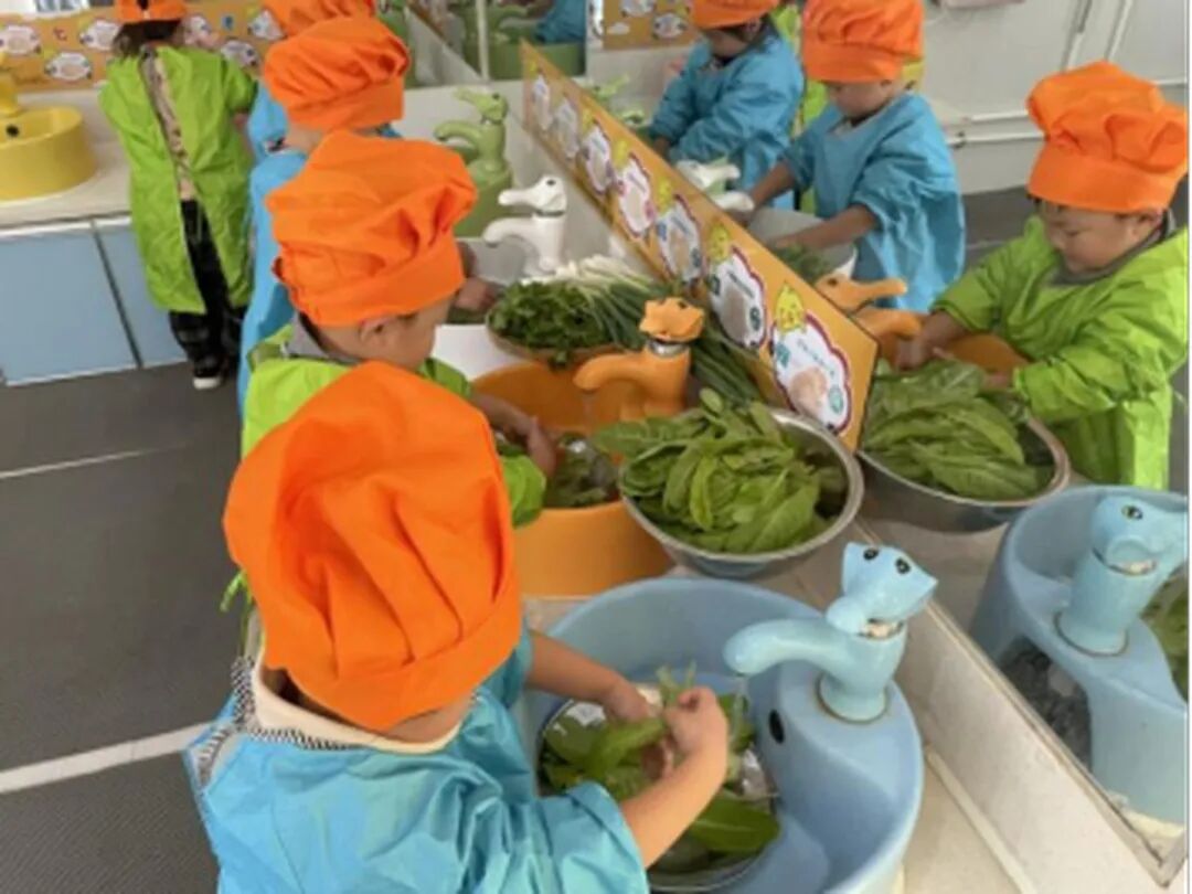 帶著新鮮的蔬菜回到活動室,洗菜池邊瞬間熱鬧起來。孩子們踮著腳尖,把香菜、小蔥和油麥菜放進清水里?!袄蠋煟悴松嫌型?,我要把它洗干凈!” 一個小朋友邊說邊用小手輕輕搓著香菜葉;洗小蔥的孩子則把蔥葉一根一根分開,仔細沖掉縫隙里的雜質;洗油麥菜的孩子更是小心翼翼,捧著寬大的菜葉,讓清水慢慢流過每一片葉子。洗好的蔬菜擺在盤子里,香菜的清香、小蔥的辛香和油麥菜的淡香混在一起,整個活動室都飄著好聞的味道。