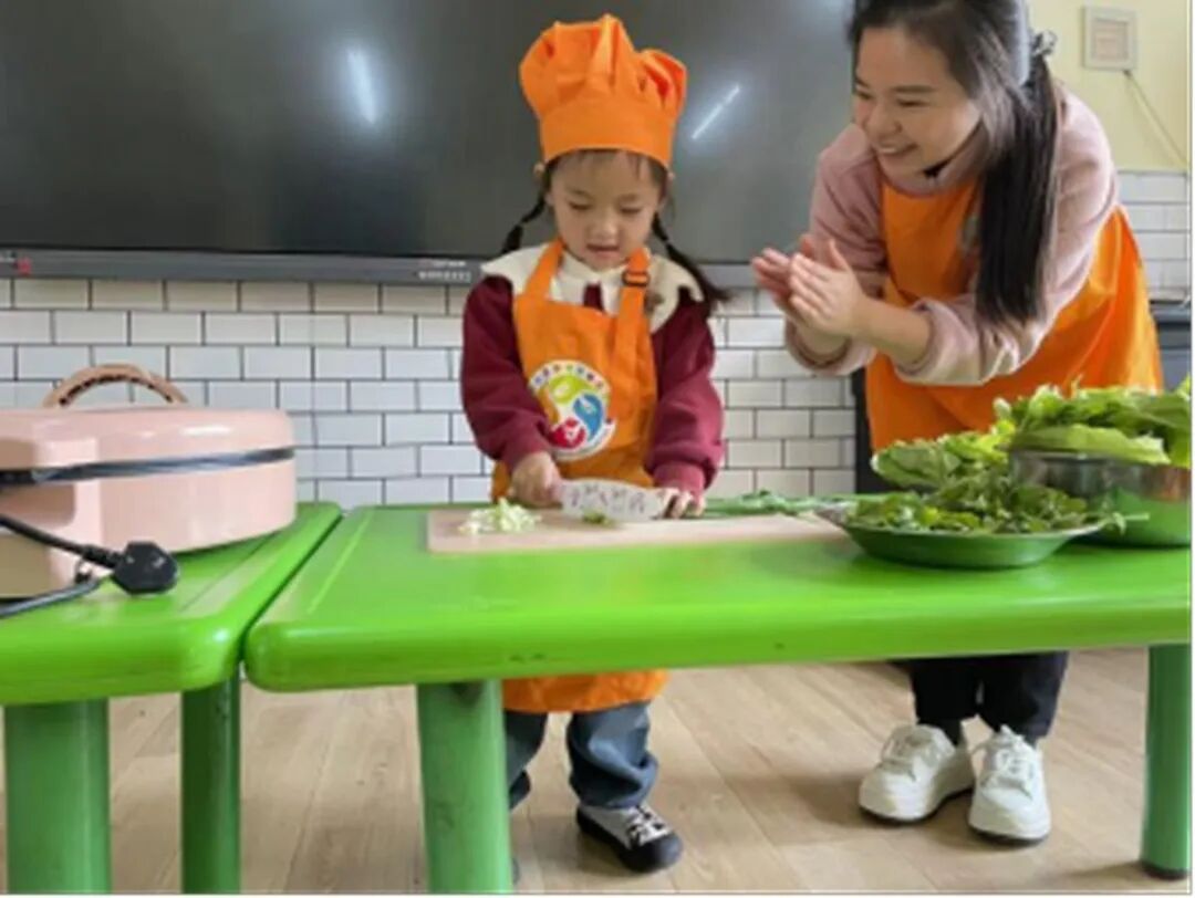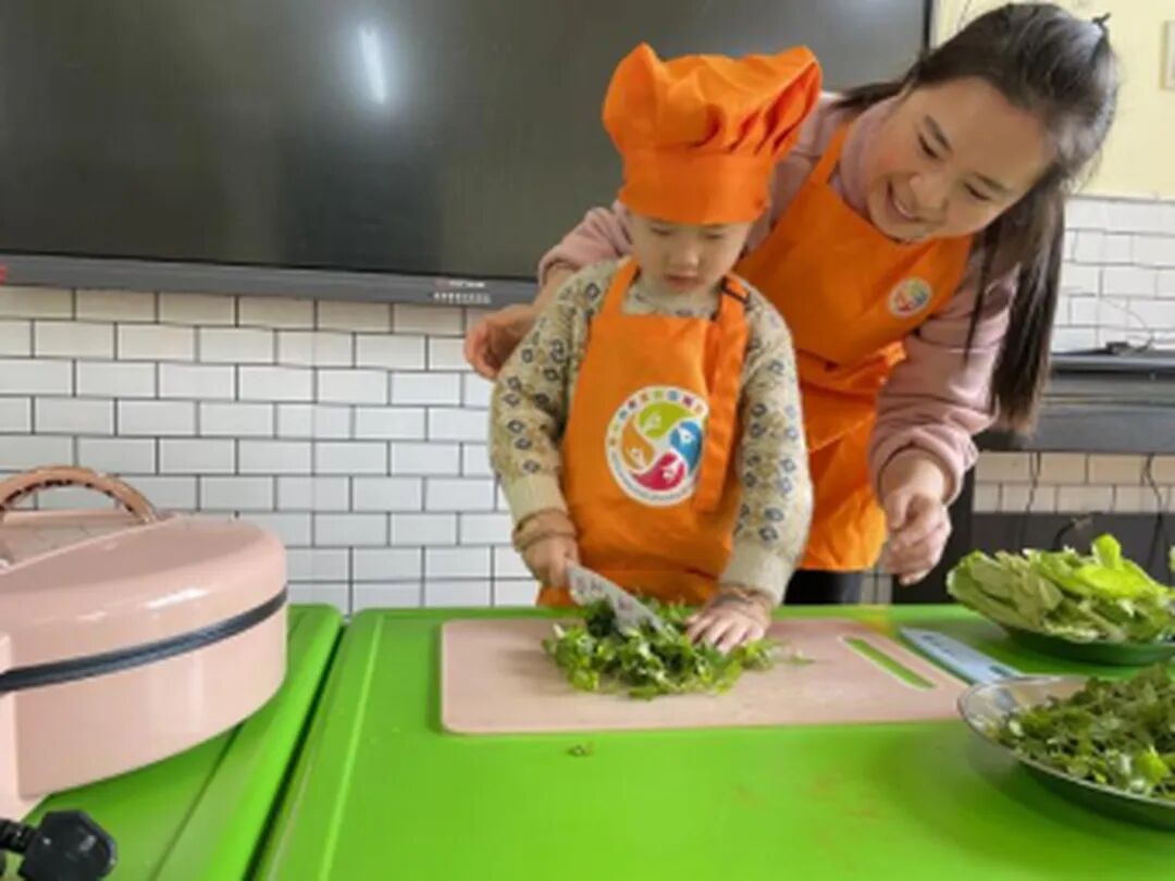 切菜環節開始啦!孩子們在老師的帶領下切菜,孩子們握著小刀,慢慢比劃著。有的小朋友把菜擺得整整齊齊,一點一點往下切,雖然切出來的小段有長有短,卻透著滿滿的用心,不一會兒,盤子里就裝滿了切好的蔬菜碎,翠綠的顏色格外誘人。