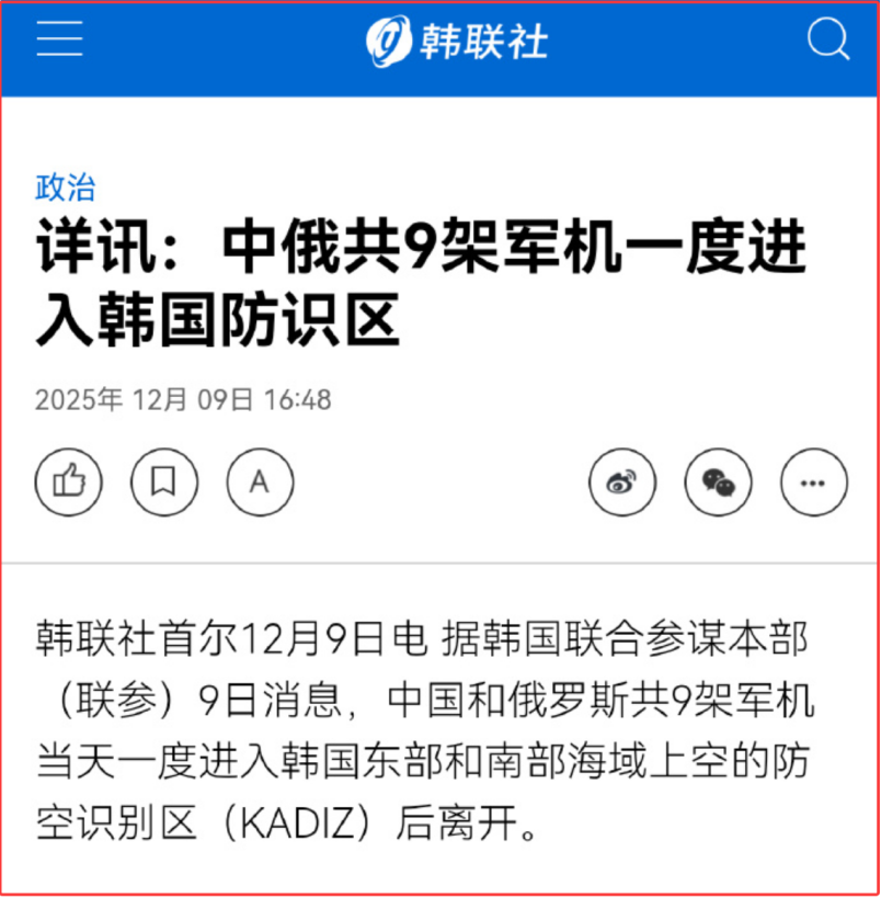 御用攝影師提供的情報,得到了韓國方面的印證。據韓聯社報道,9日上午10時許,7架俄羅斯軍機和2架中國軍機先后進入韓國東部和南部的“防空識別區”。