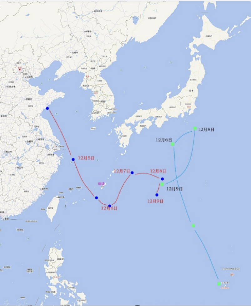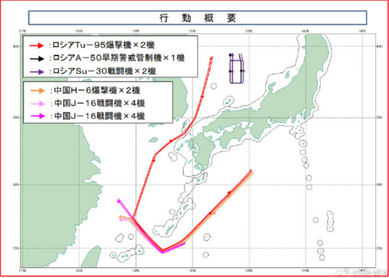 御用攝影師提供的航跡圖顯示,俄軍2架圖-95從日本海飛到東海后,與中方2架轟-6K會合,編隊中出宮古后,再沿琉球群島東南側向東北方向飛行。