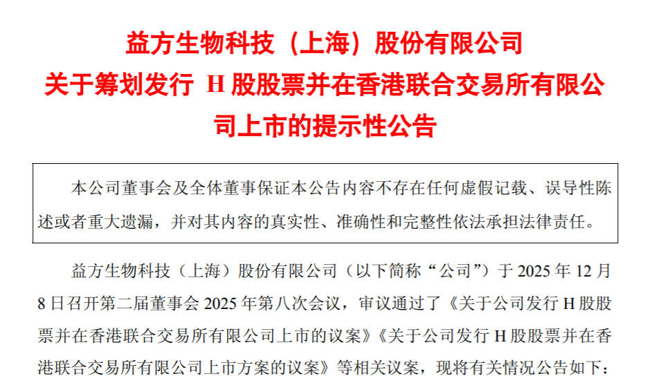 瑞財經 王敏 12月9日,益方生物科技(上海)股份有限公司(以下簡稱“益方生物”)發布公告稱,為進一步提高公司的資本實力和綜合競爭力,深入推進公司發展戰略,更好利用國際資本市場的多元化融資渠道,公司擬于境外發行股份(H股),并申請在港交所主板掛牌上市。