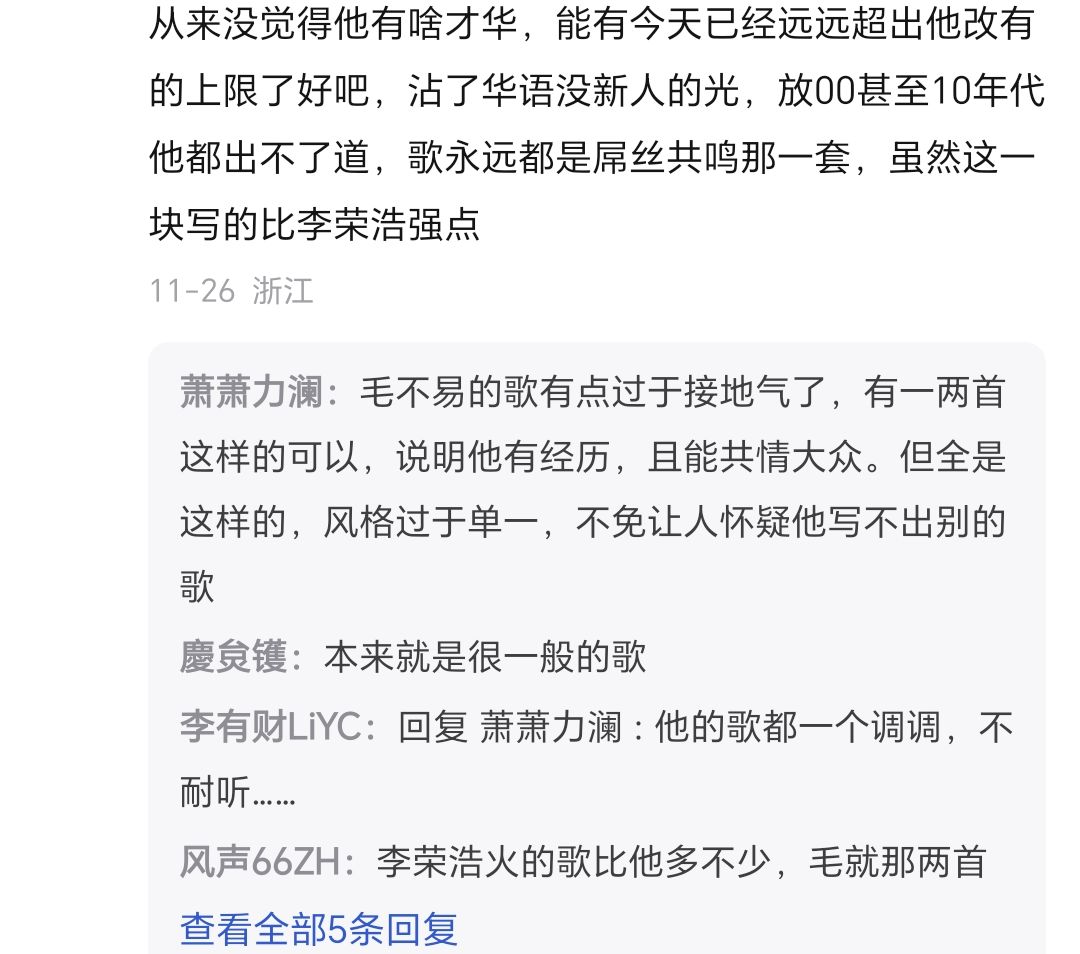這是目前多數網友給出的結論,毛不易之所以現如今會混成這樣,是因為風格單一。
