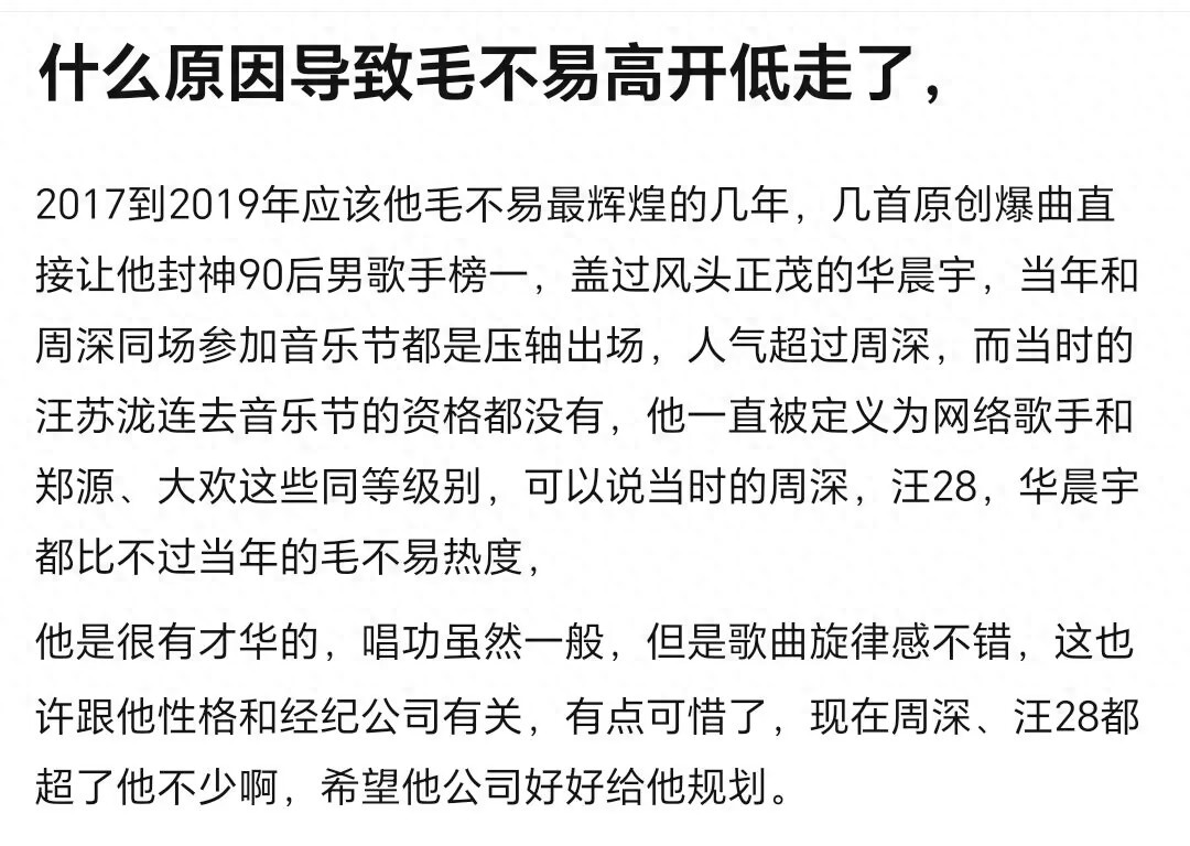 所以,在我看來,毛不易的高開低走,是多個原因促成。