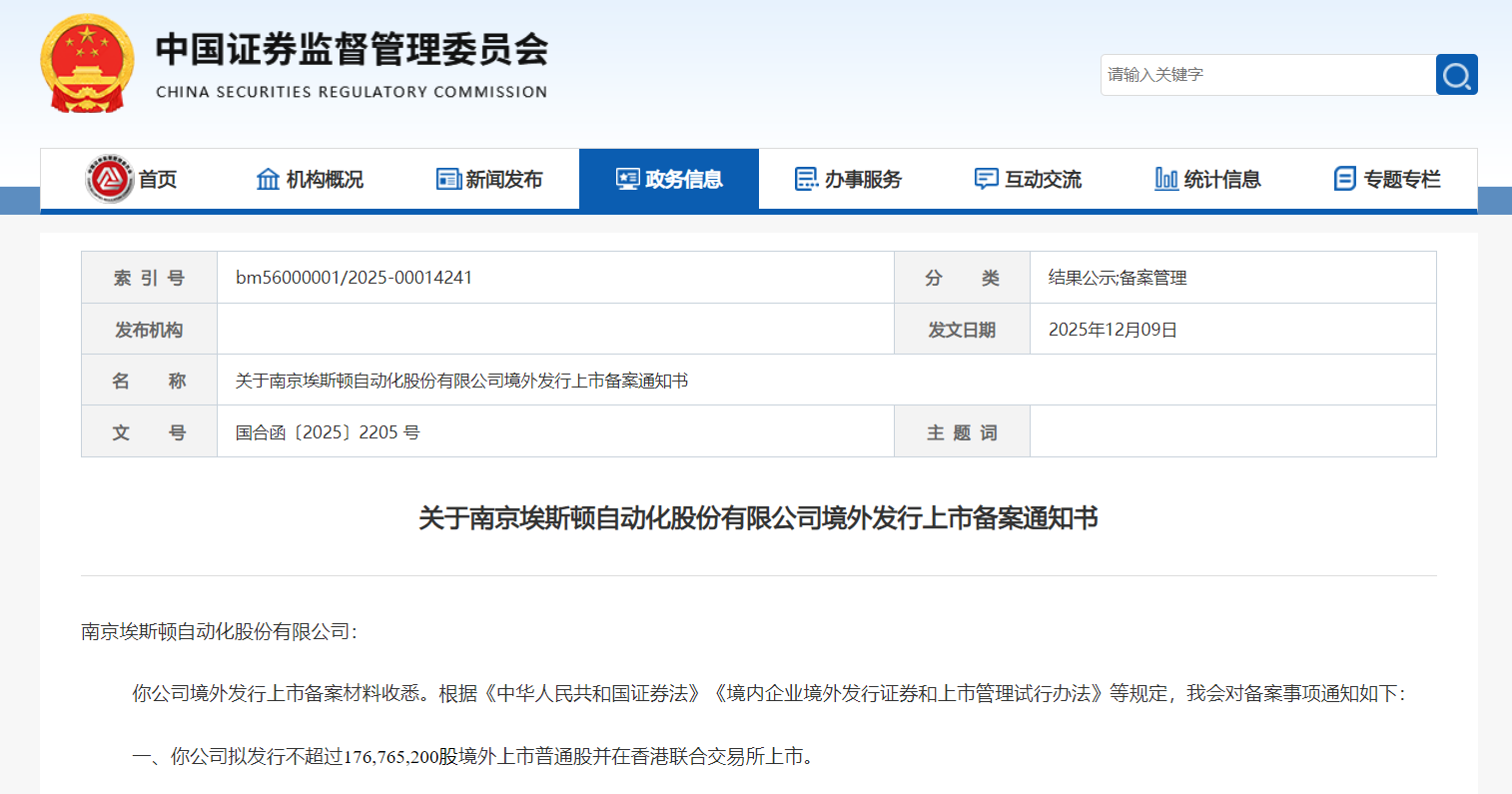 瑞財經(jīng) 趙盼盼 12月9日,中國證監(jiān)會國際合作司發(fā)布關(guān)于南京埃斯頓自動化股份有限公司(以下簡稱“埃斯頓”)境外發(fā)行上市備案通知書。