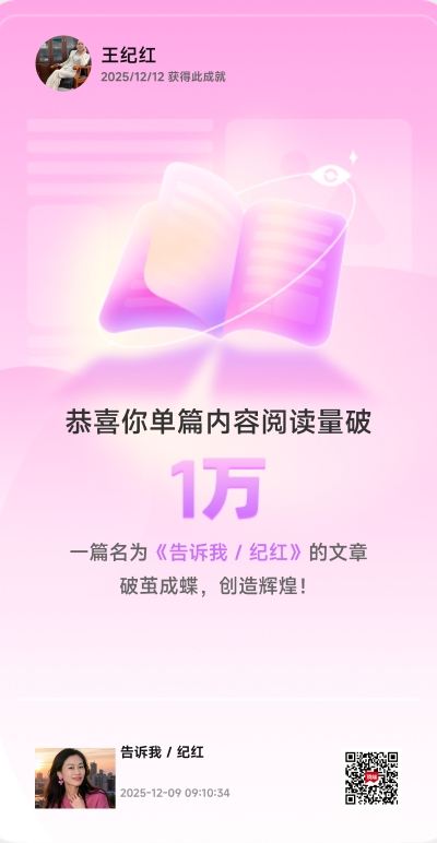 合上詩卷,墨香仍在指尖縈繞。王紀紅的詩歌告訴我們:真正的文學從不是消遣的玩具,而是靈魂的鏡子、時代的備忘錄。在這個信息爆炸卻精神貧瘠的時代,她堅持用最傳統的方式(詩歌)守護著最珍貴的財富(情感),用最純凈的筆墨(意象)雕刻著最永恒的瞬間(靈魂契合)。這或許就是她能屢獲大獎、打動萬千讀者的秘密。因為每個字都浸透著生命的體溫,每行詩都閃耀著人性的光芒。