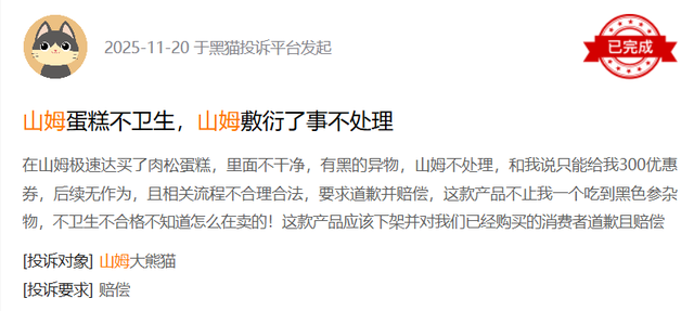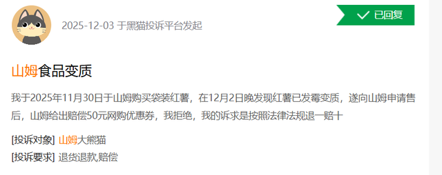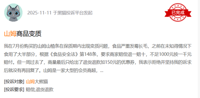 截至2025年12月10日,據(jù)黑貓投訴平臺,有超13000條投訴包含搜索詞山姆,主要涉及食品有異物、食物變質(zhì)以及售假等問題。