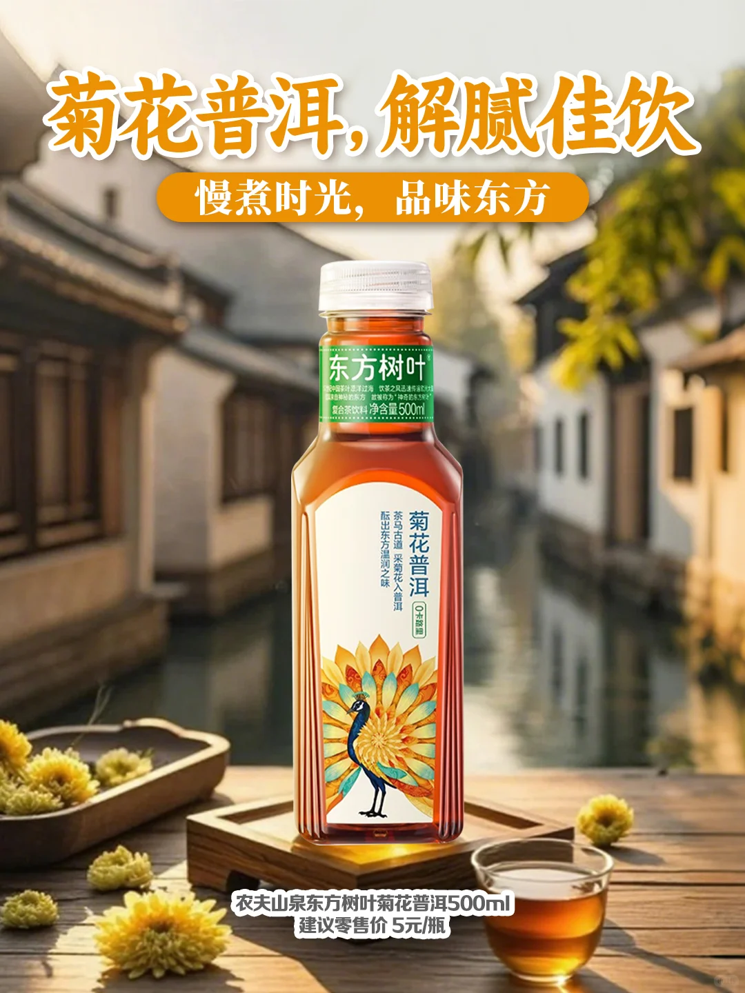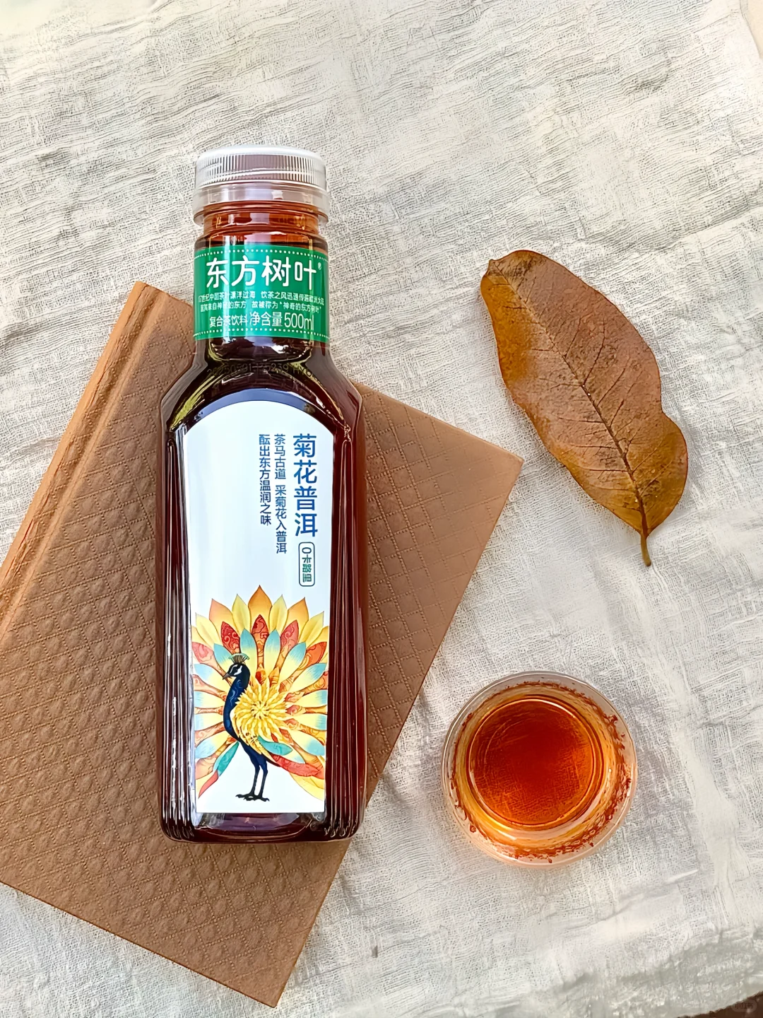 事實上,雖然農夫山泉并未官宣,其官方旗艦店也沒有售賣,但在今年5月份東方樹葉還推出了另外一款新口味菊花普洱,最開始定位為“廣東限定”。根據食品板了解的信息,該產品“完美復刻了廣東早茶中菊花普洱的經典風味”,選用云南普洱和優質菊花融合而成。其中,菊花采用的是桐鄉的精品胎菊,香氣更濃郁,回甘也更清潤。瓶身上有優雅的孔雀圖案,為品茶增添了幾分視覺美感。