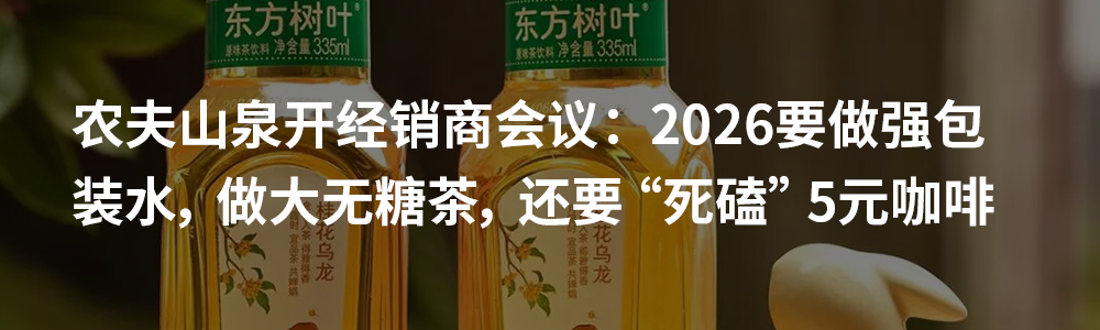 最近這段時間,農夫山泉正在全國各地密集召開經銷商大會,會上不僅復盤了公司的發展歷程,更釋放出2026年三大戰略信號:做強水、做大茶、拓新品。具體來說,就是要“鞏固包裝水業務基本盤、擴大東方樹葉等茶飲料的規模、重點推動包括即飲咖啡等在內的新品市場拓展”。
