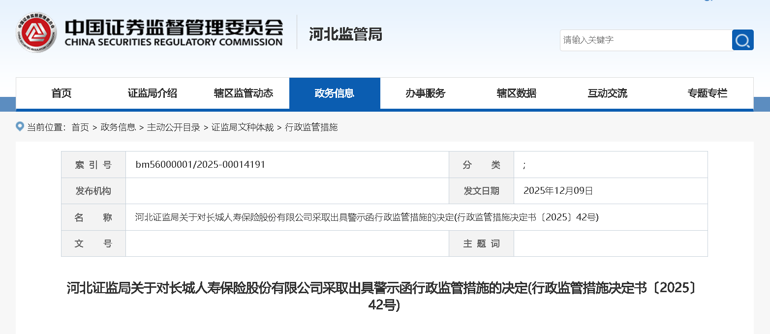 瑞財經 鐘鳴辰 據河北證監局12月9日行政監管公告,河北證監局于11月21日發布行政監管措施決定書〔2025〕42號,對長城人壽保險股份有限公司采取出具警示函的行政監管措施。