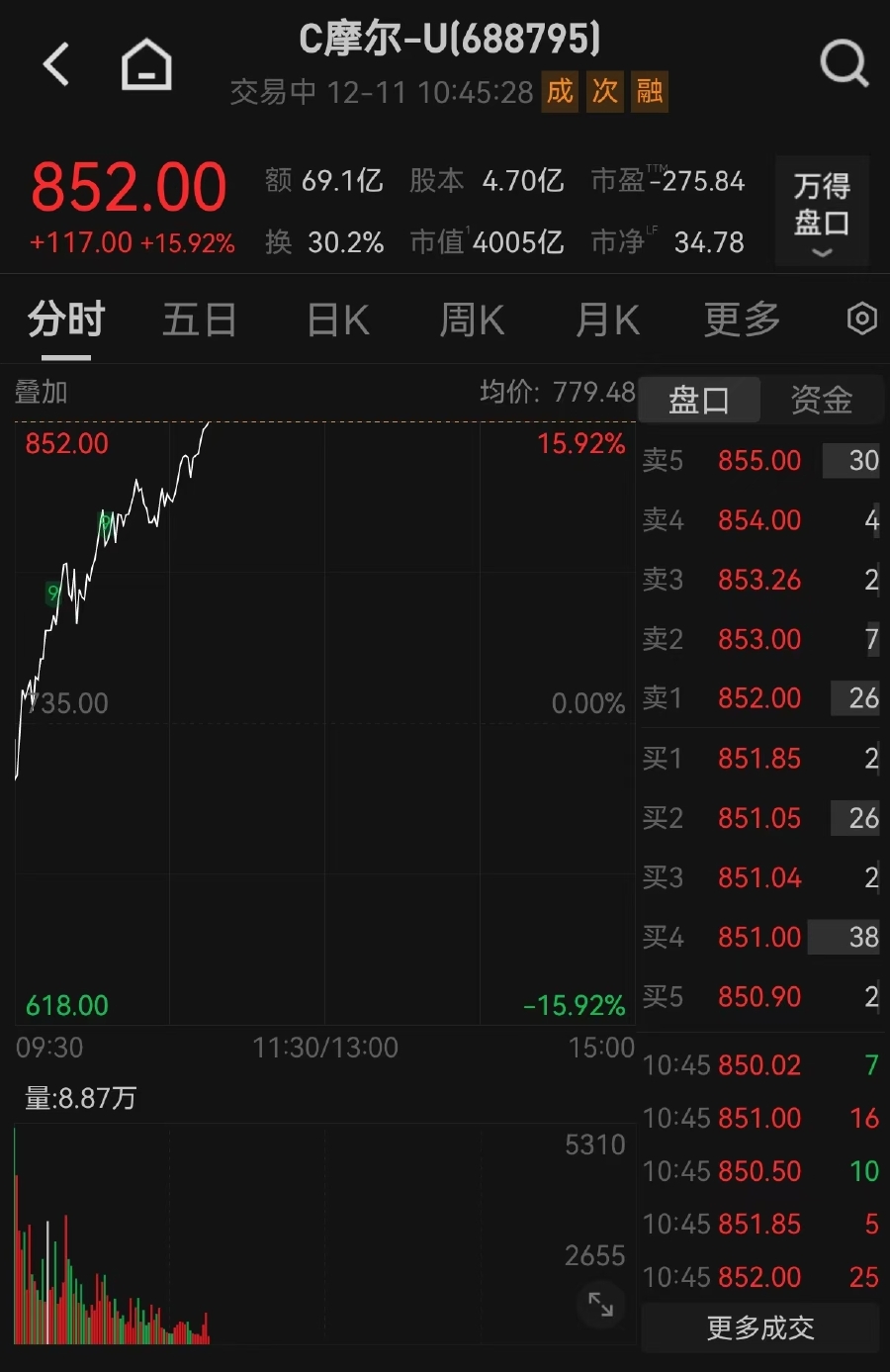 【大河財立方消息】12月11日,截至10點45分發稿,摩爾線程股價上漲15.92%,達852元/股,市值4005億元,再創新高。