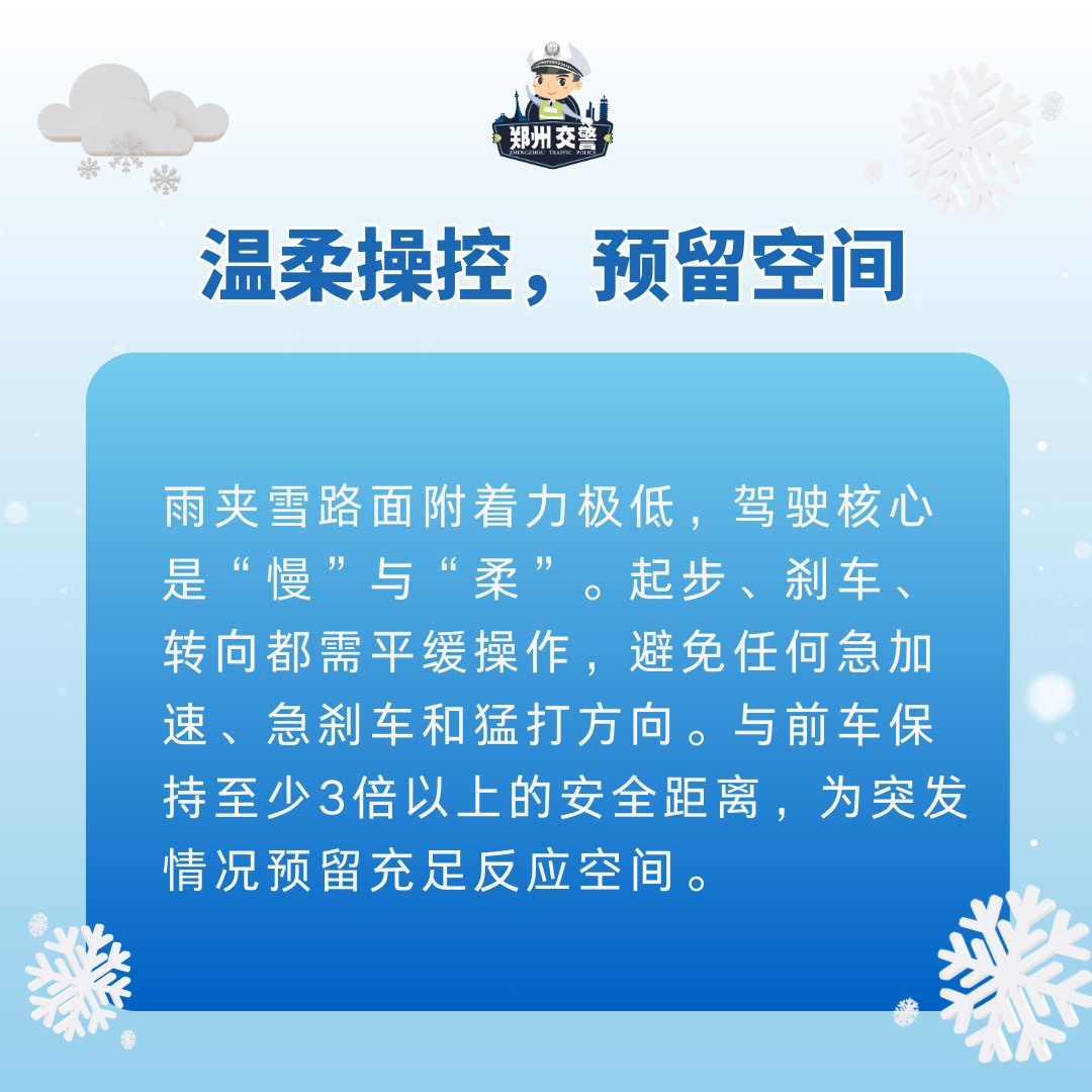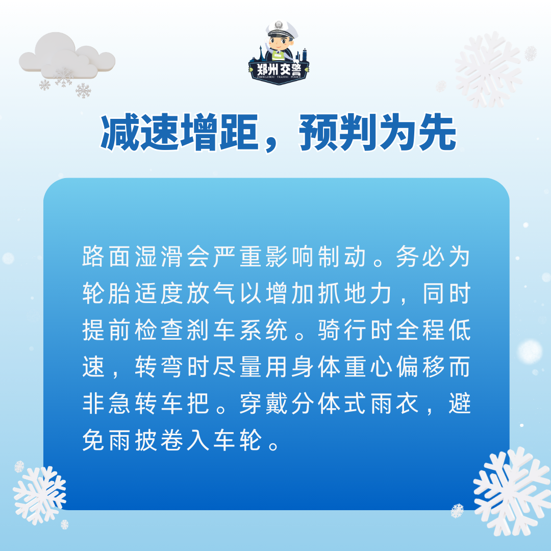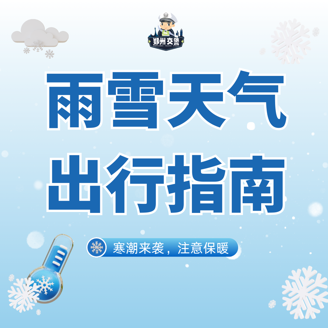 #安全出行微提醒# 【雨雪天氣安全出行指南請查收!】受高空槽和強冷空氣的共同影響,預計11日夜里至12日鄭州有一次雨雪強降溫天氣過程,主要降雪時段在12日白天到夜里,降水量6~10毫米,局部10~15毫米。雨雪天氣出行,請合理選擇交通工具,降低速度、預留空間、保持視野清晰、做好充分準備。 安全第一,平安抵達!