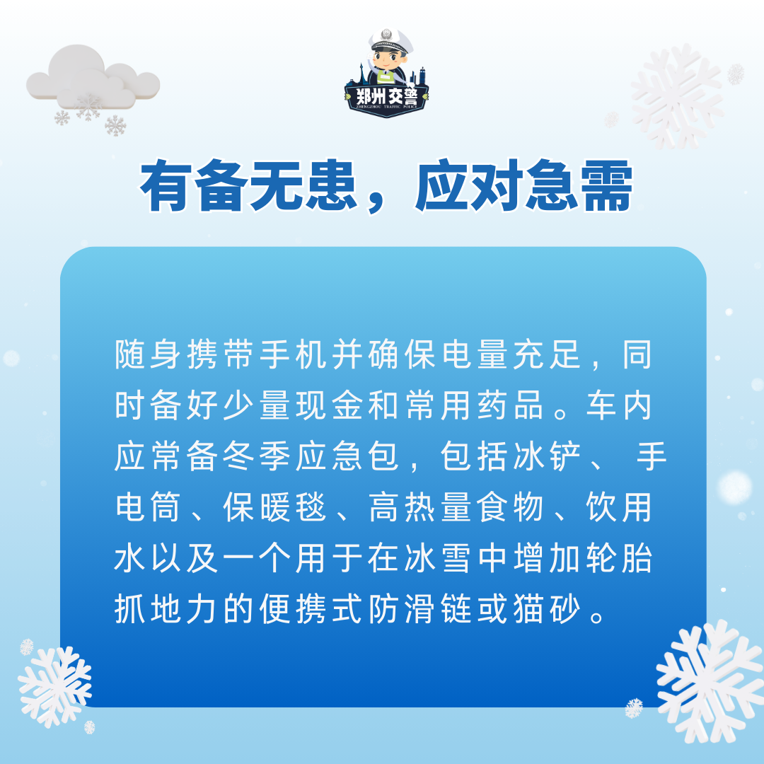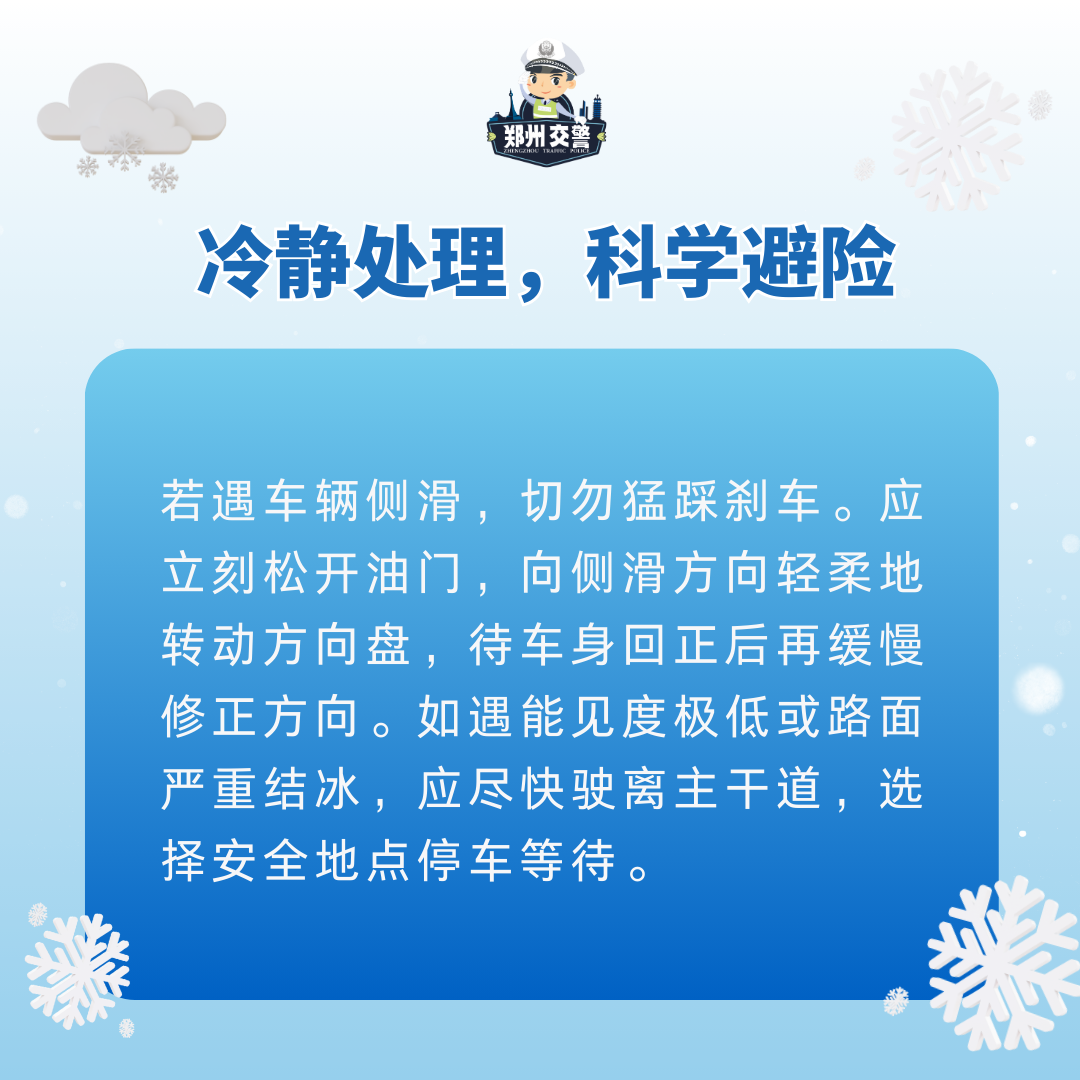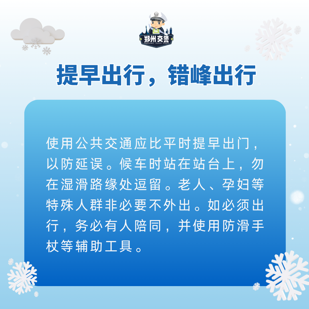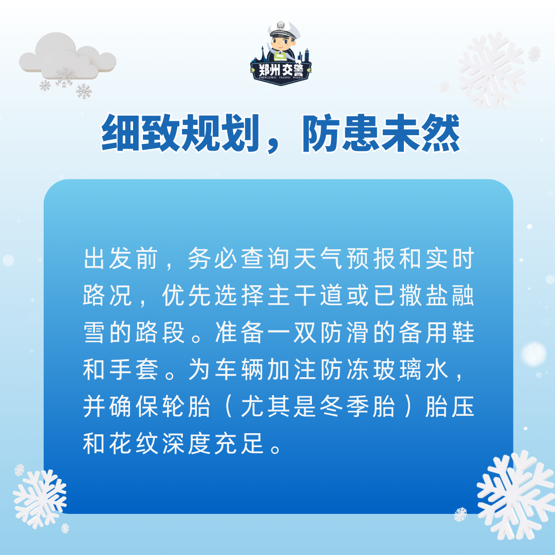 #安全出行微提醒# 【雨雪天氣安全出行指南請查收!】受高空槽和強冷空氣的共同影響,預計11日夜里至12日鄭州有一次雨雪強降溫天氣過程,主要降雪時段在12日白天到夜里,降水量6~10毫米,局部10~15毫米。雨雪天氣出行,請合理選擇交通工具,降低速度、預留空間、保持視野清晰、做好充分準備。 安全第一,平安抵達!