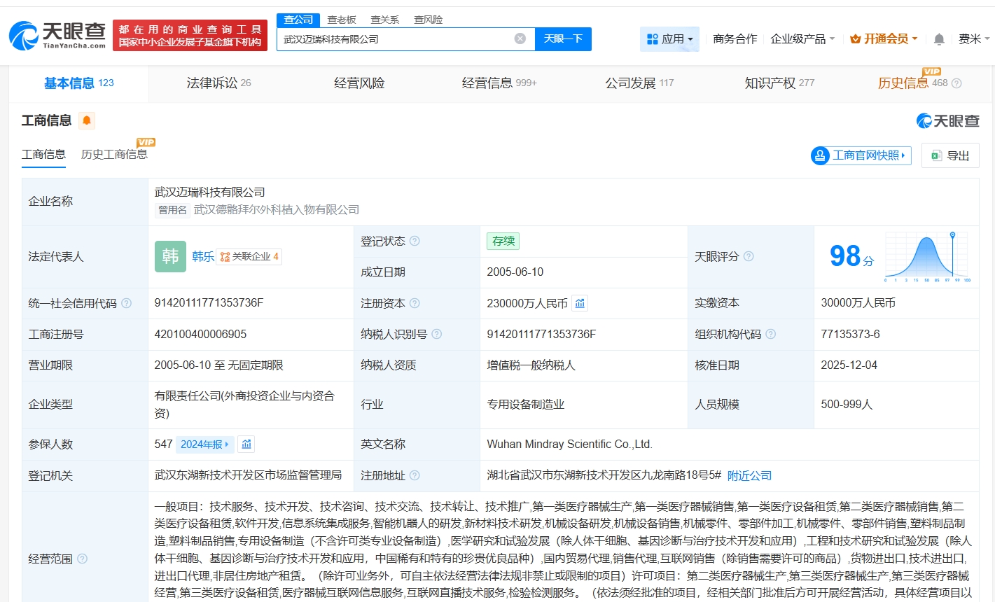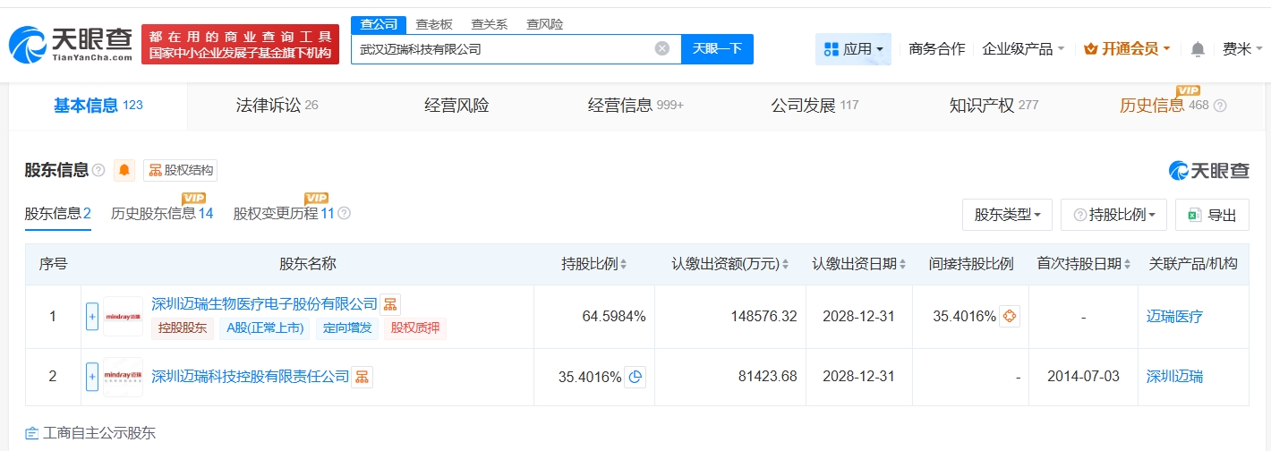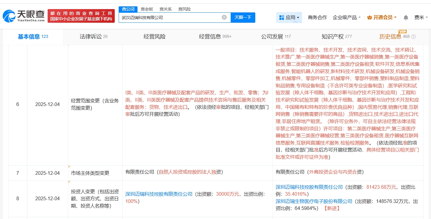 該公司成立于2005年6月,經營范圍包括第一類醫療器械生產、第二類醫療器械銷售、智能機器人的研發等,現由深圳邁瑞科技控股有限責任公司及上述新增股東共同持股。