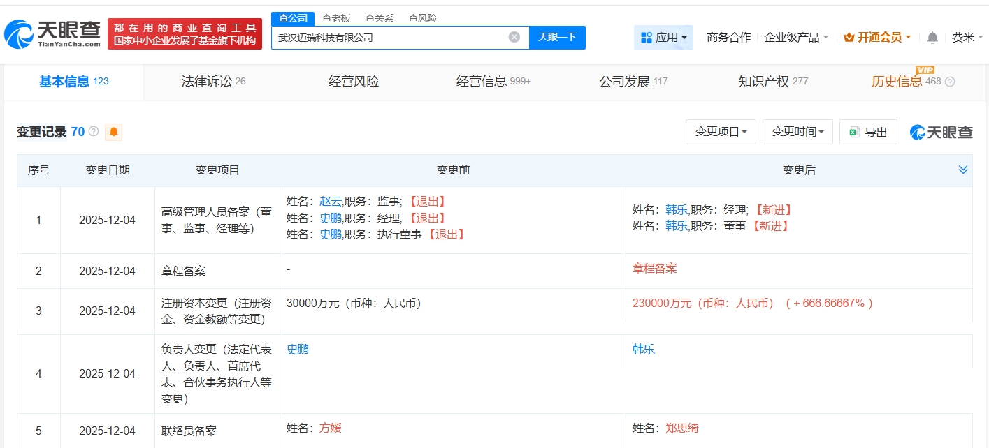 天眼查App顯示,近日,武漢邁瑞科技有限公司發生工商變更,史鵬卸任法定代表人、執行董事、經理,韓樂接任法定代表人、經理并擔任董事,新增邁瑞醫療(300760)為股東,同時,注冊資本由3億人民幣增至23億人民幣,增幅約667%…