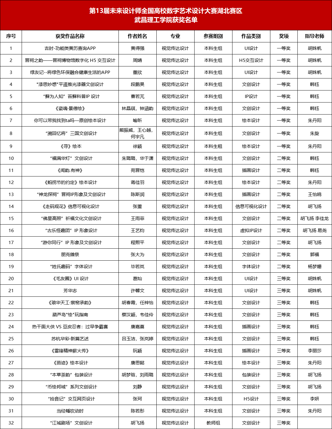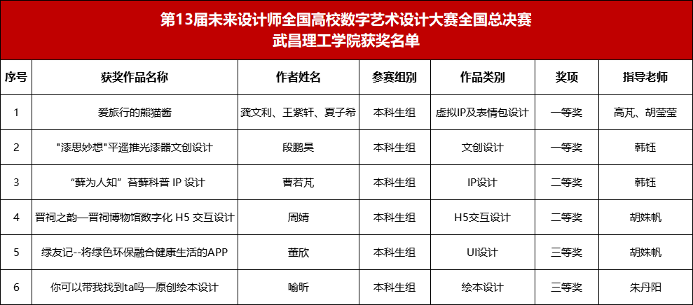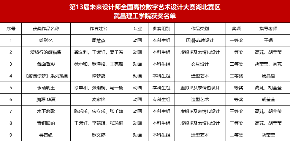近日,2025未來設計師·全國高校數字藝術設計大賽(NCDA)獲獎結果揭曉。武昌理工學院創意設計學院再創歷史新高,共斬獲全國總決賽一等獎2項、二等獎2項、三等獎2項,并在湖北省賽區榮獲41項大獎。